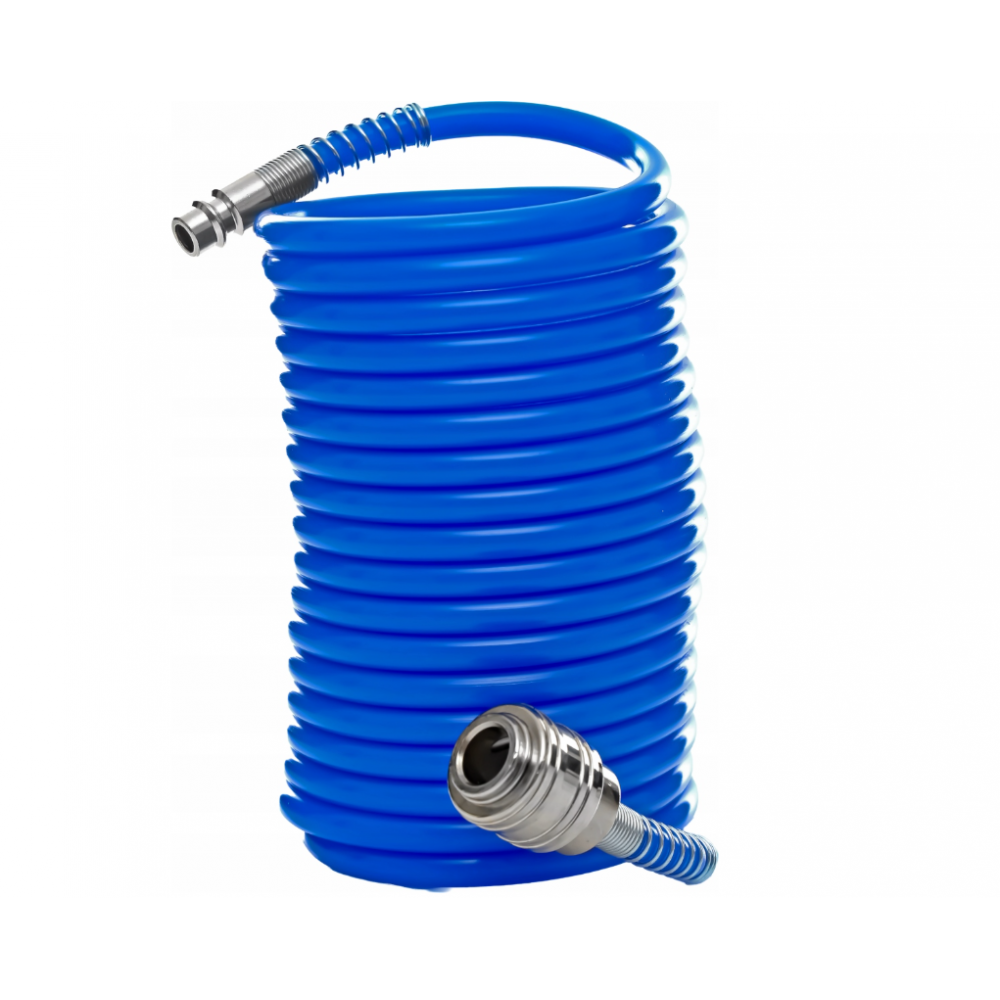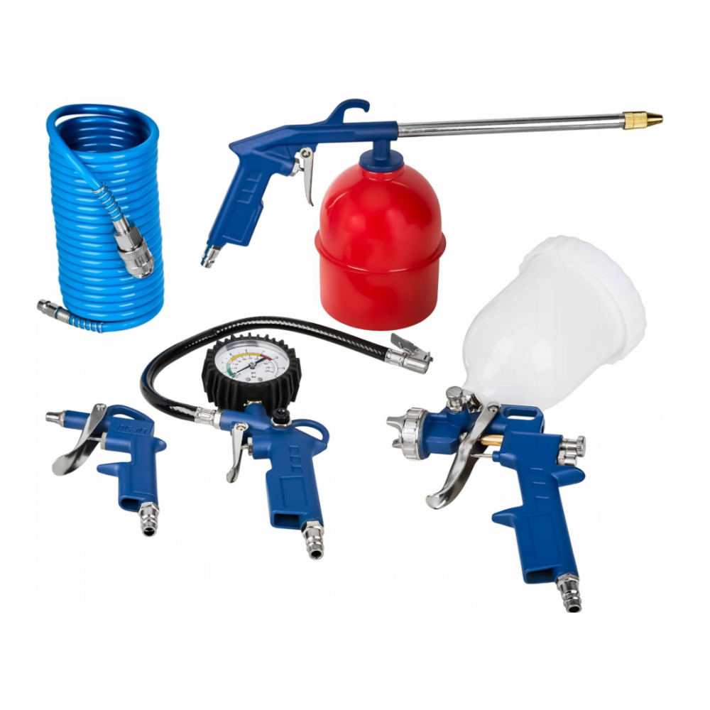 5️⃣ 5 metru spirālveida gaisa šļūtene - saderīga ar smidzināšanas pistolēm, pneimatiskajiem instrumentiem un citām ierīcēm, nodrošina darba brīvību un ērtības darbnīcā.