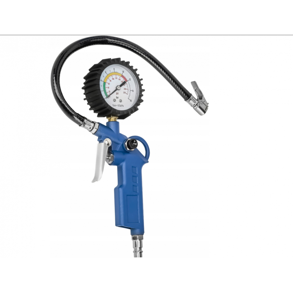 3️⃣ Piepūšanas pistole ar spiediena mērītāju - ļauj ātri un ērti piepūst automašīnu riepas, bumbas, matračus, piepūšamās laivas un rotaļlietas, kā arī kontrolēt spiedienu, pateicoties gumijas pulksteņa korpusam un gaisa izlaišanas vārstam.