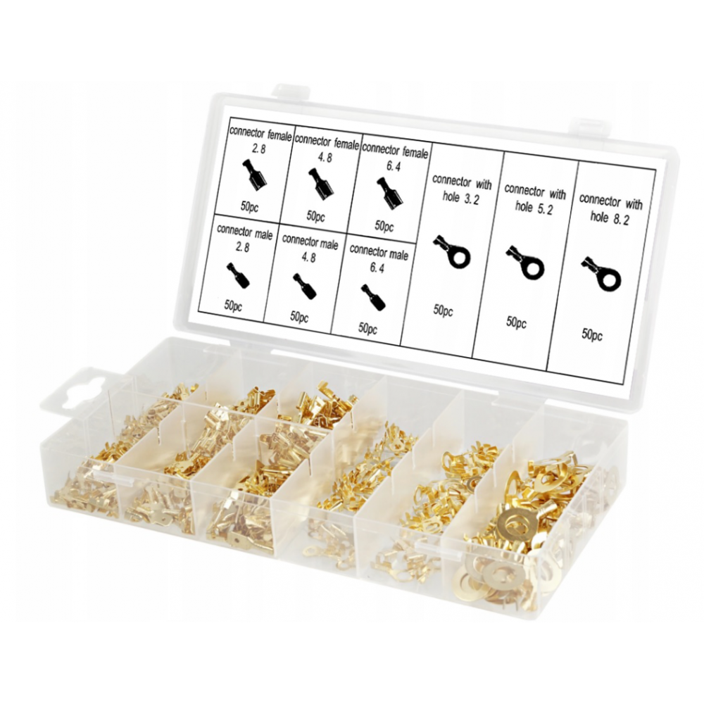Kabeļu savienotāji izturīgā plastmasas korpusā, sakārtoti pēc izmēra atsevišķos nodalījumos.