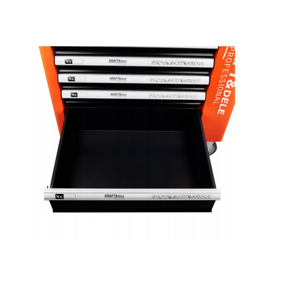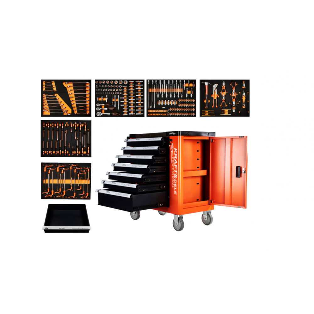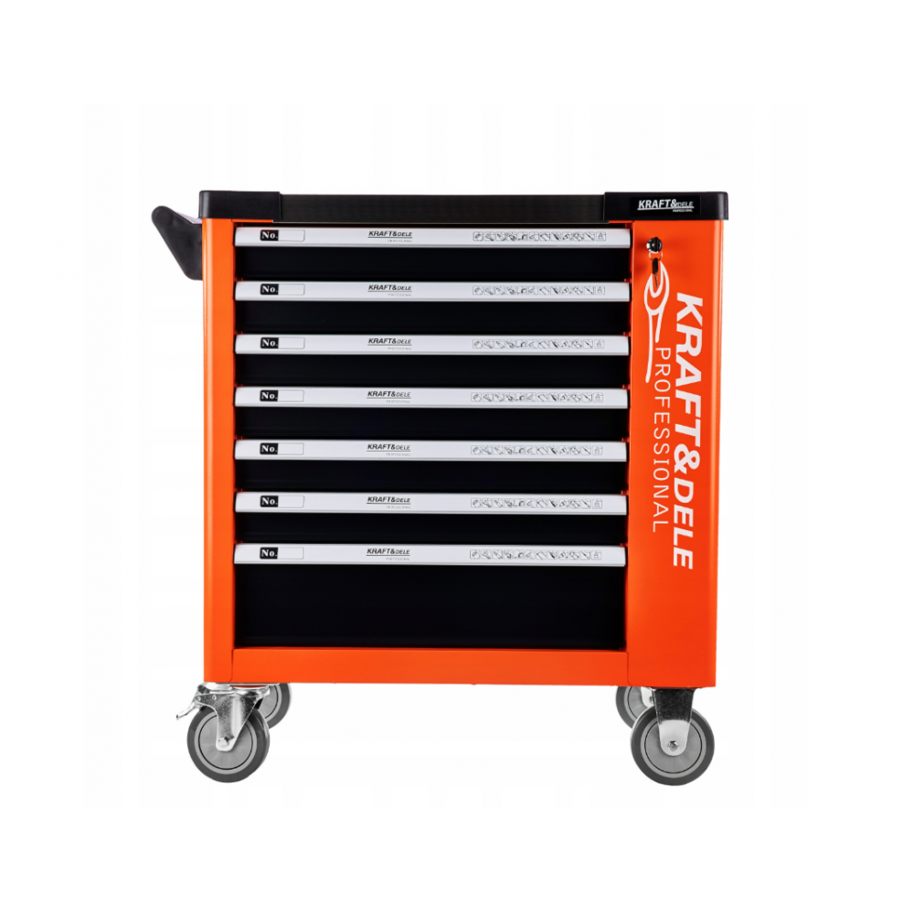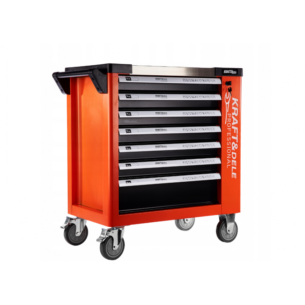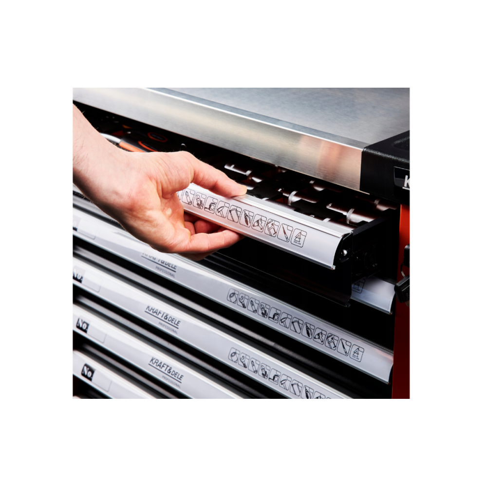 Šie profesionālie instrumentu ratiņi nodrošina efektīvu darba vietas organizēšanu un drošu instrumentu aizsardzību, pateicoties centrālajai bloķēšanas sistēmai ar divām atslēgām un papildu divu līmeņu, slēdzamu uzglabāšanas nodalījumu. Ergonomisks rokturis, kas integrēts sānu sienā, un četri riteņi, tostarp divi grozāmi riteņi , garantē pilnīgu mobilitāti un ērtu manevrēšanu pat šaurās darbnīcas telpās. Papildu drošībai transportēšanas laikā skapis ir aprīkots ar stūra buferiem, kas aizsargā apkārtējo virsmu, piemēram, transportlīdzekļa virsbūvi, no nejaušiem bojājumiem.