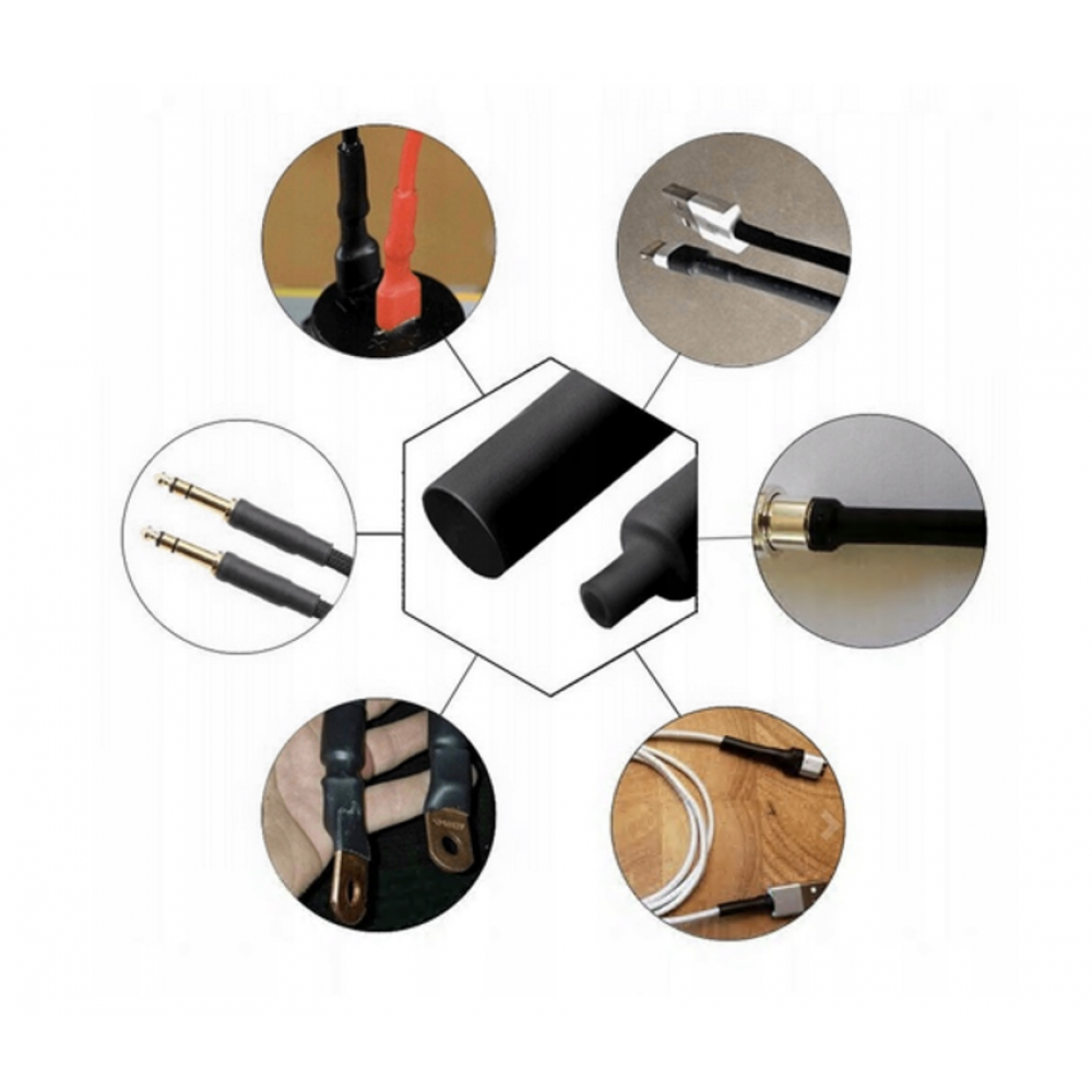 Vienkārši pievienojiet vadus, uzlieciet uzmavu un uzsildiet to ar šķiltavu vai karstā gaisa pistoli. Pēc šīs darbības uzmava saruks līdz pat pusei no sava tilpuma un ieņems objekta formu, uz kura tā tiek sarauties.