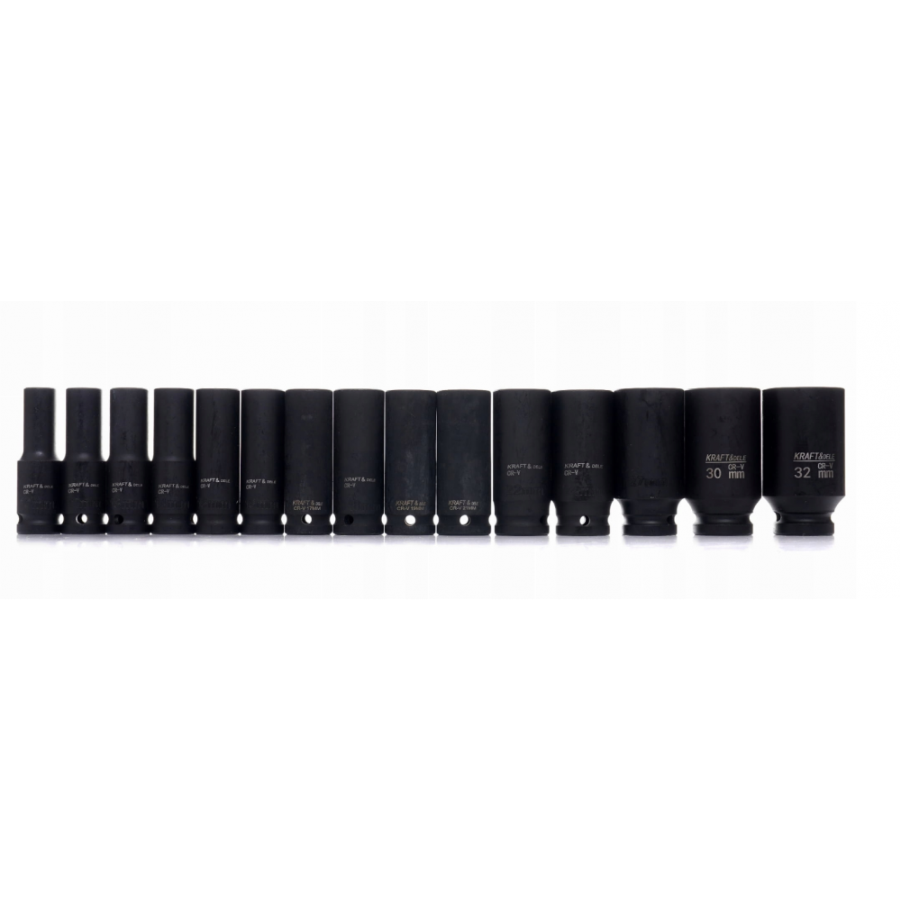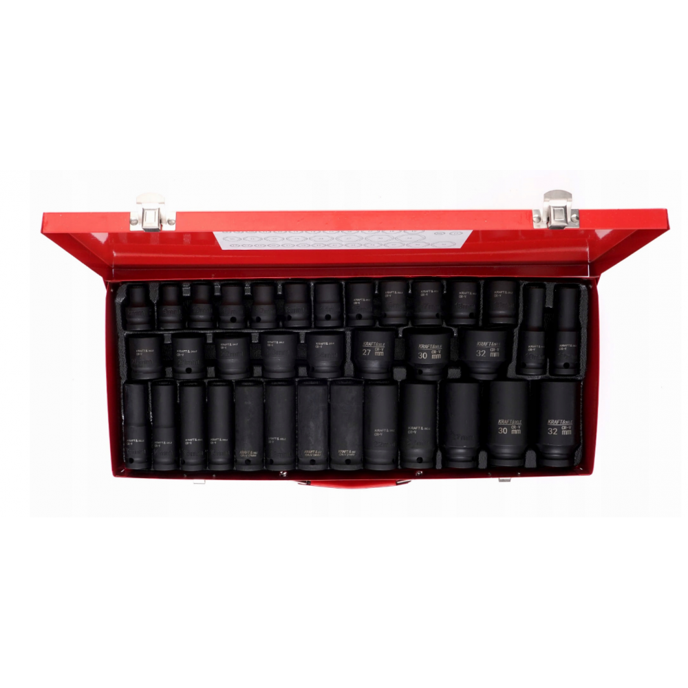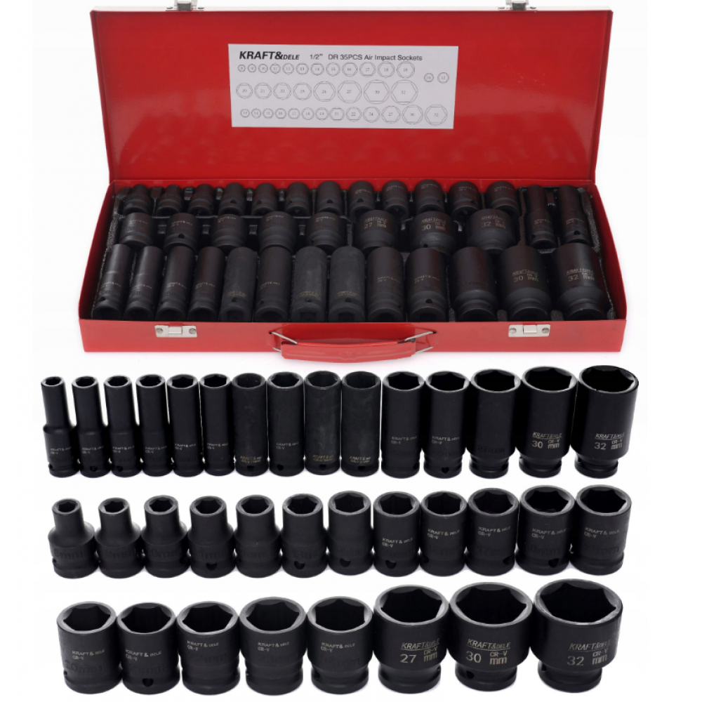 KD11756 ir profesionāls KRAFT&DELE triecienuzmavu komplekts, kas paredzēts intensīvai lietošanai autoservisos, riepu servisos un rūpnieciskos pielietojumos. Komplekts ir paredzēts lietošanai ar triecienskrūvgriežiem, pneimatiskajiem instrumentiem, akumulatora instrumentiem un jaudīgiem elektroinstrumentiem.