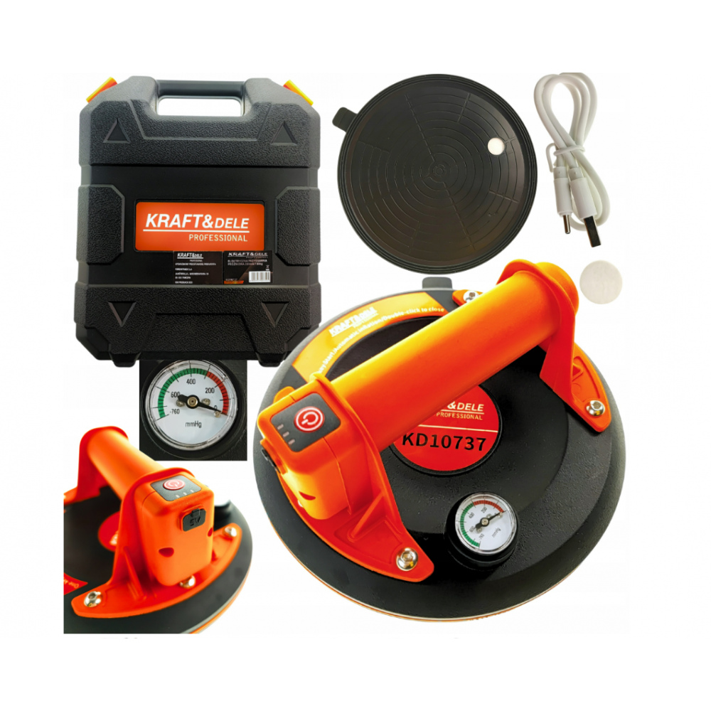Электрическая вакуумная присоска польского бренда Kraft&Dele, модель KD10737. Предназначена для перемещения различных предметов с гладкими поверхностями, таких как стекло, окна, автомобильные стекла, листовой металл, ламинат и т. д.