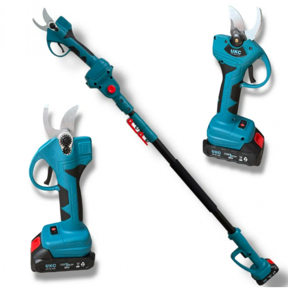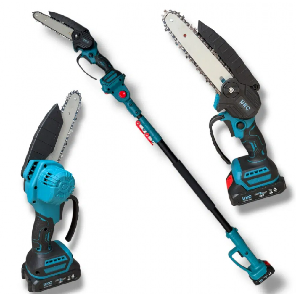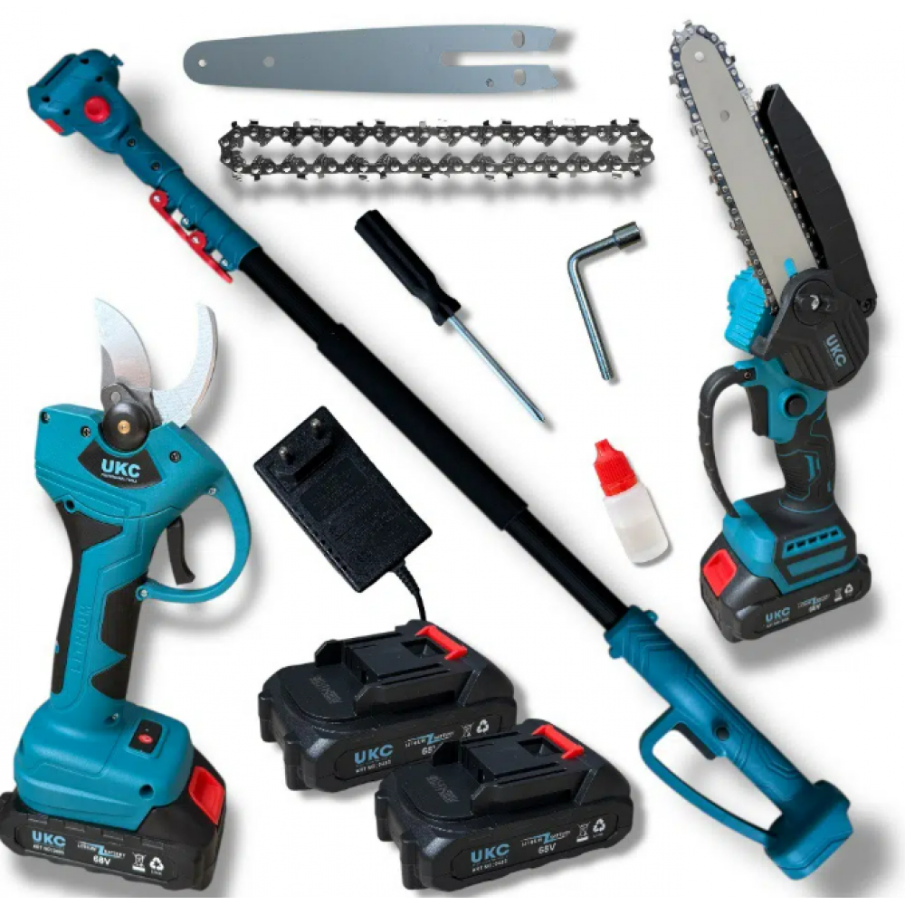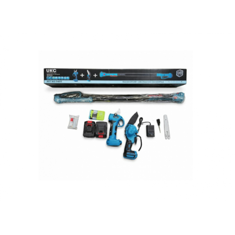 Profesionālajā komplektā ietilpst UKC 2в1 - elektriskais teleskopiskais dārza šķērs un 6 collu akumulatora ķēdes zāģis. Darbināms ar 21 W litija jonu akumulatoru, tas ir ideāli piemērots zaru apgriešanai līdz 25 mm biezumā un koksnes griešanai. Kāts rotē par 180 grādiem un ir regulējams garumā no 110 cm līdz 200 cm.