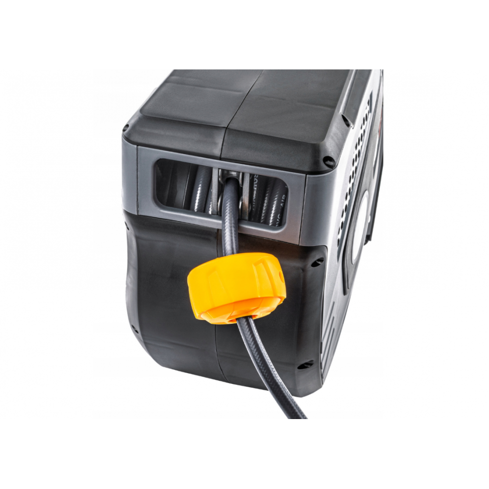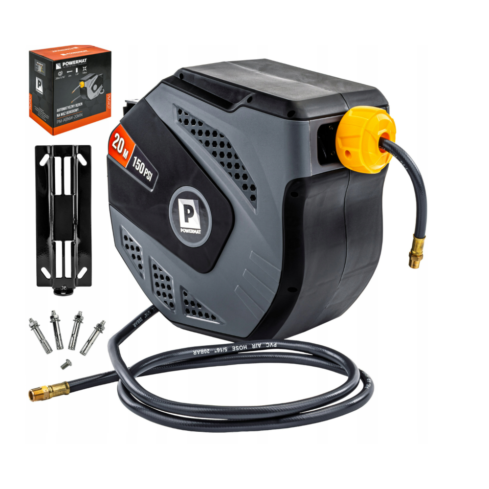 Powermat automātiskā gaisa šļūtenes spole ir praktiska ierīce, kas vienkāršo darbu darbnīcā. Ar automātisku pārtinšanu, 180° rotāciju un kompaktu, izturīgu PP korpusu tā piedāvā ērtu lietošanu un vietu taupošu funkcionalitāti. Produkts, kas paredzēts lietošanai mājās, nodrošina drošību, pateicoties šļūtenes fiksatoram un vienkāršai montāžai.
