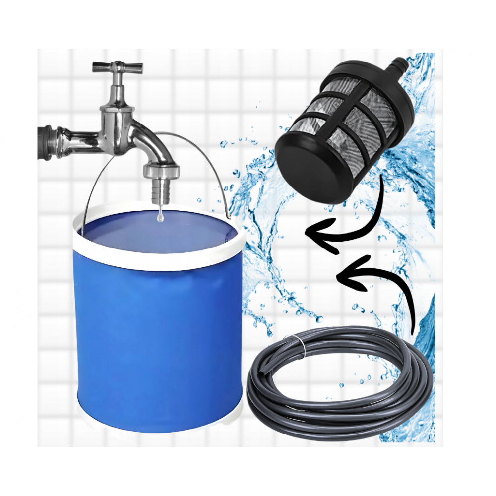 ✅ Ūdens savākšanas komplekts – spainis, 5 m šļūtene un filtrs vienā!
