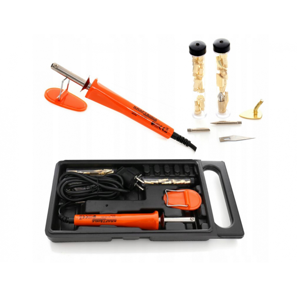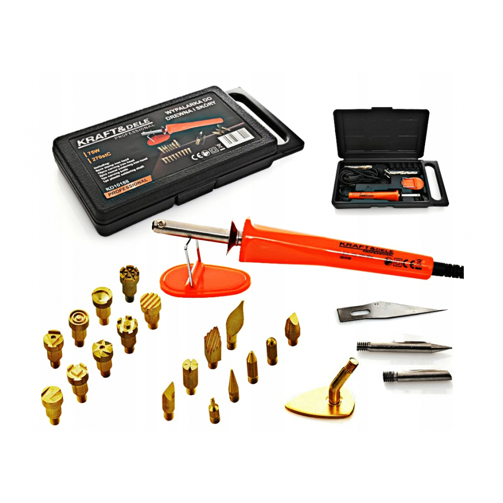 Šis Polijas zīmola Kraft&Dele malkas un ādas deglis, modelis KD10188 , tiek izmantots, lai, izmantojot komplektā iekļautos uzgaļus, dekorētu priekšmetus no koka, ādas un korķa, kā arī citus priekšmetus. Ierīce sasniedz temperatūru līdz 270°C , padarot dedzināšanu neticami vienkāršu un ātru.