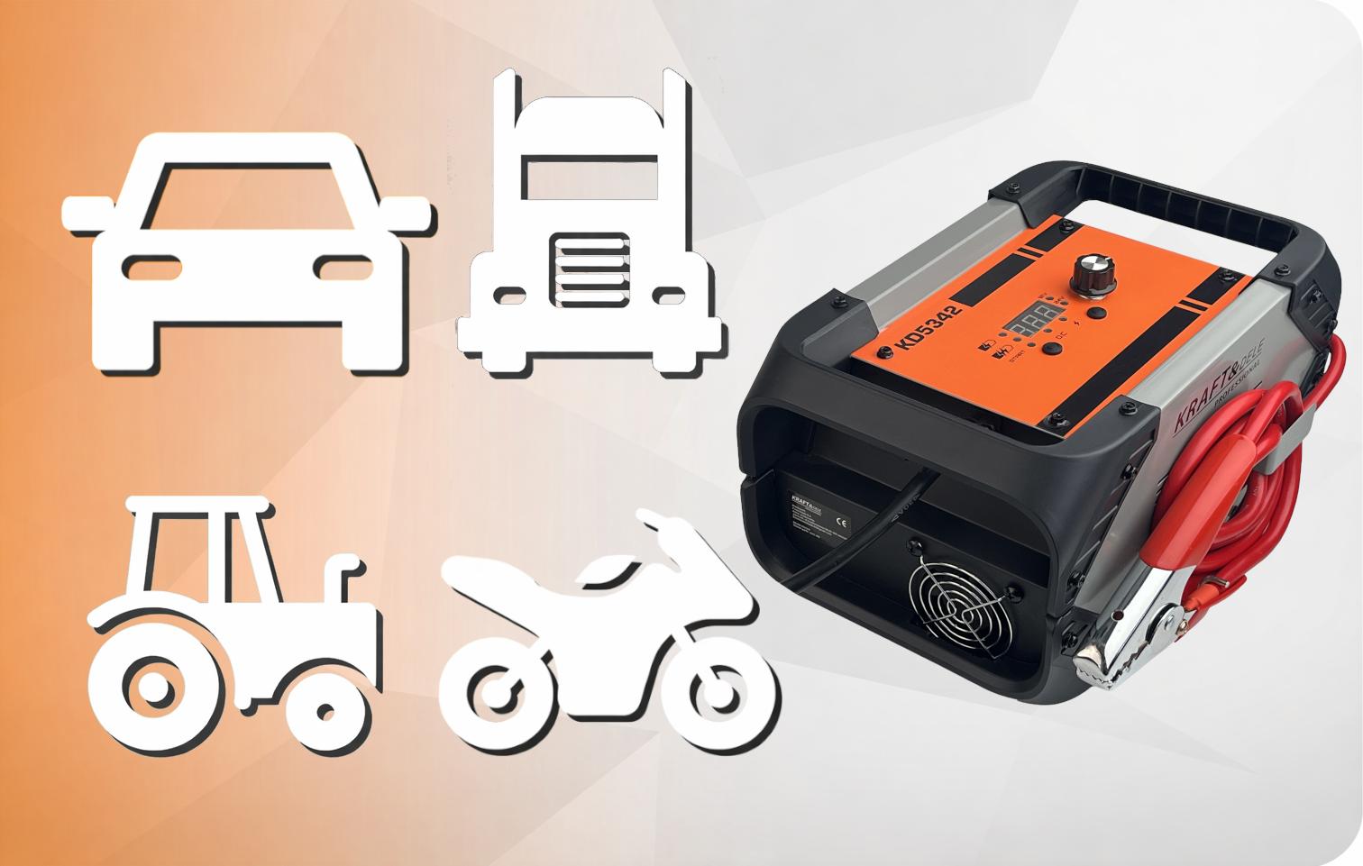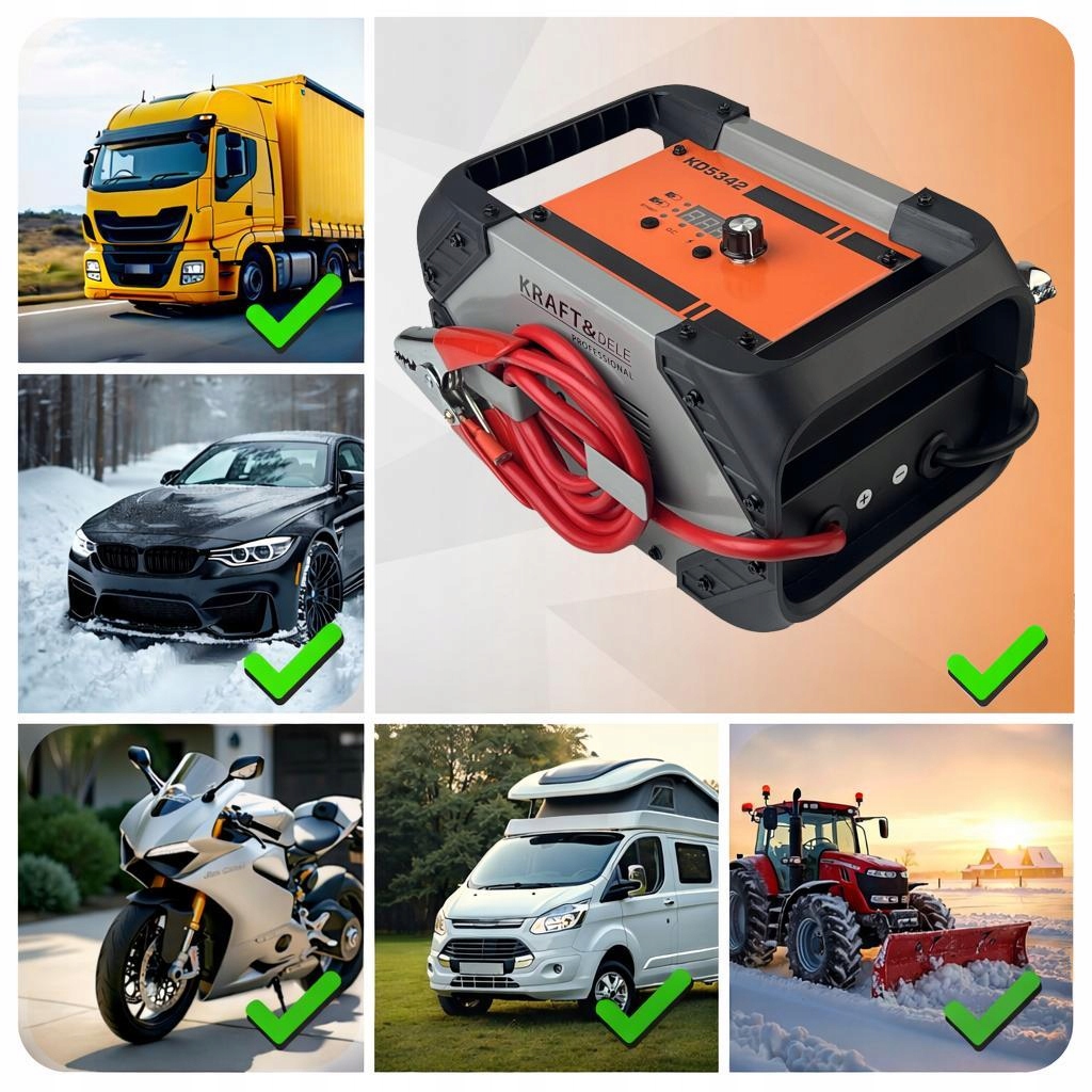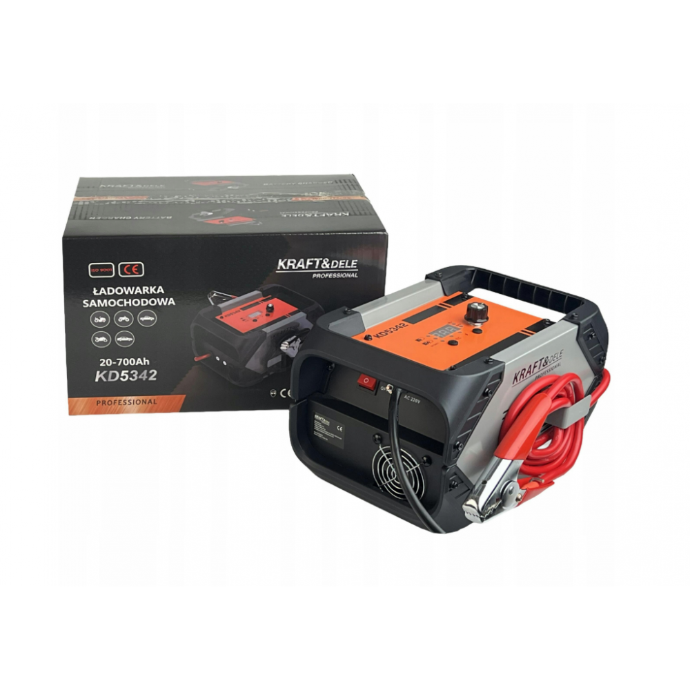 KD5342 akumulatora lādētājs ar starteri ir kompakta, automātiska ierīce akumulatoru uzlādēšanai un 220 A dzinēju iedarbināšanai. Pateicoties izmantotajai modernajai tehnoloģijai, lādētājs piedāvā augstu efektivitāti, aizsardzību pret pārkaršanu un īsslēgumu, LCD ekrānu un augstas kvalitātes korpusu, kas ir ideāli piemērots lietošanai darbnīcās un vieglo automašīnu, kravas automašīnu un lauksaimniecības tehnikas apkopei.