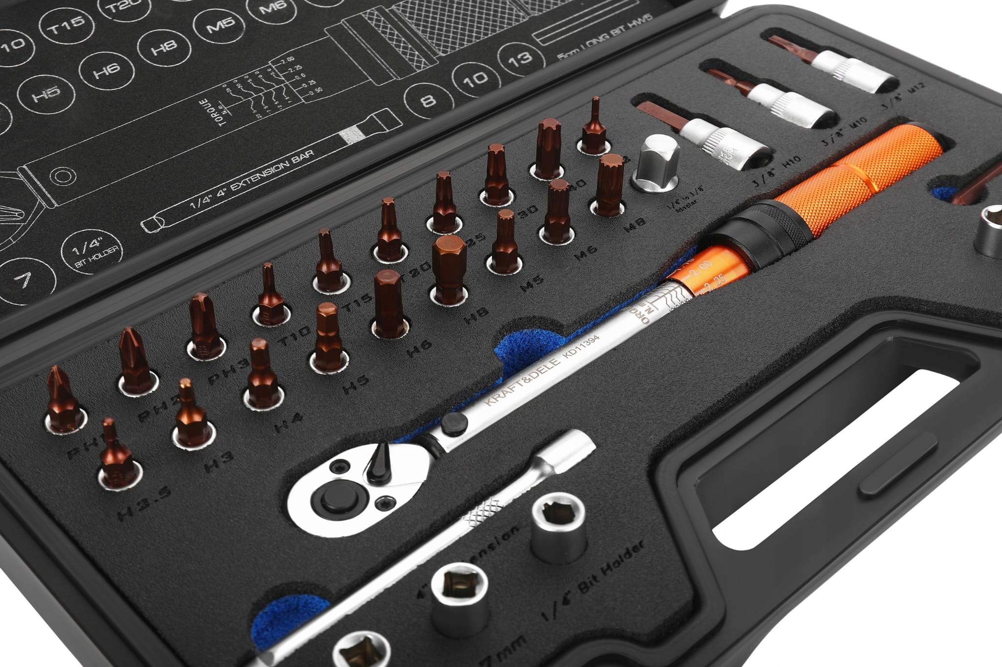 GRIEZES MOMENTA ATSLĒGU KOMPLEKTS 1/4" 5-25Nm 32 gab. UZGAĻI UN MUCIŅAS KOMPLEKTĒ KD11394