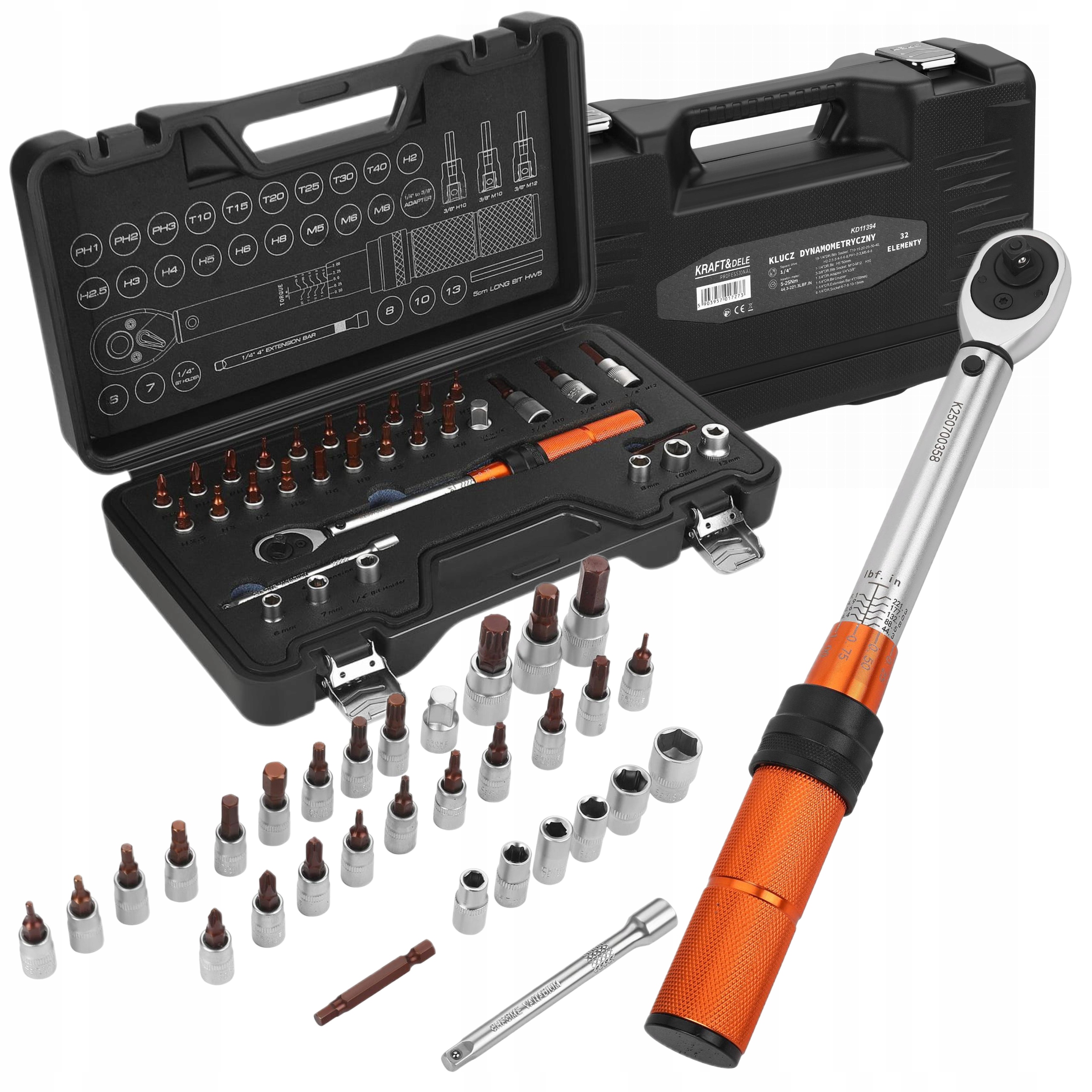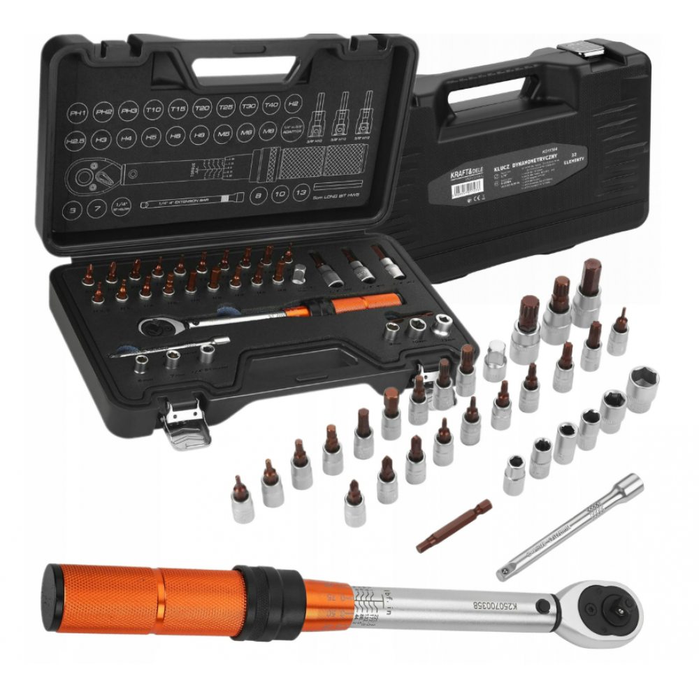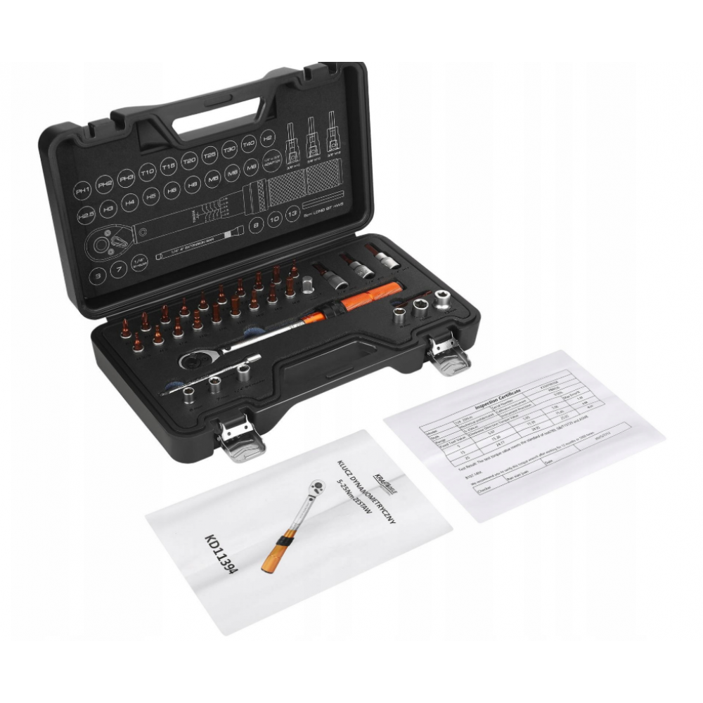KD11394 ir precīza griezes momenta atslēga ar 5–25 Nm diapazonu, kas ir ideāli piemērota gan profesionālai, gan amatieru lietošanai. Komplekts ir ievietots izturīgā plastmasas kastē ērtai uzglabāšanai un transportēšanai. Plašais piederumu komplekts nodrošina daudzpusīgu izmantošanu darbnīcā, garāžā vai apkopes darbos.
