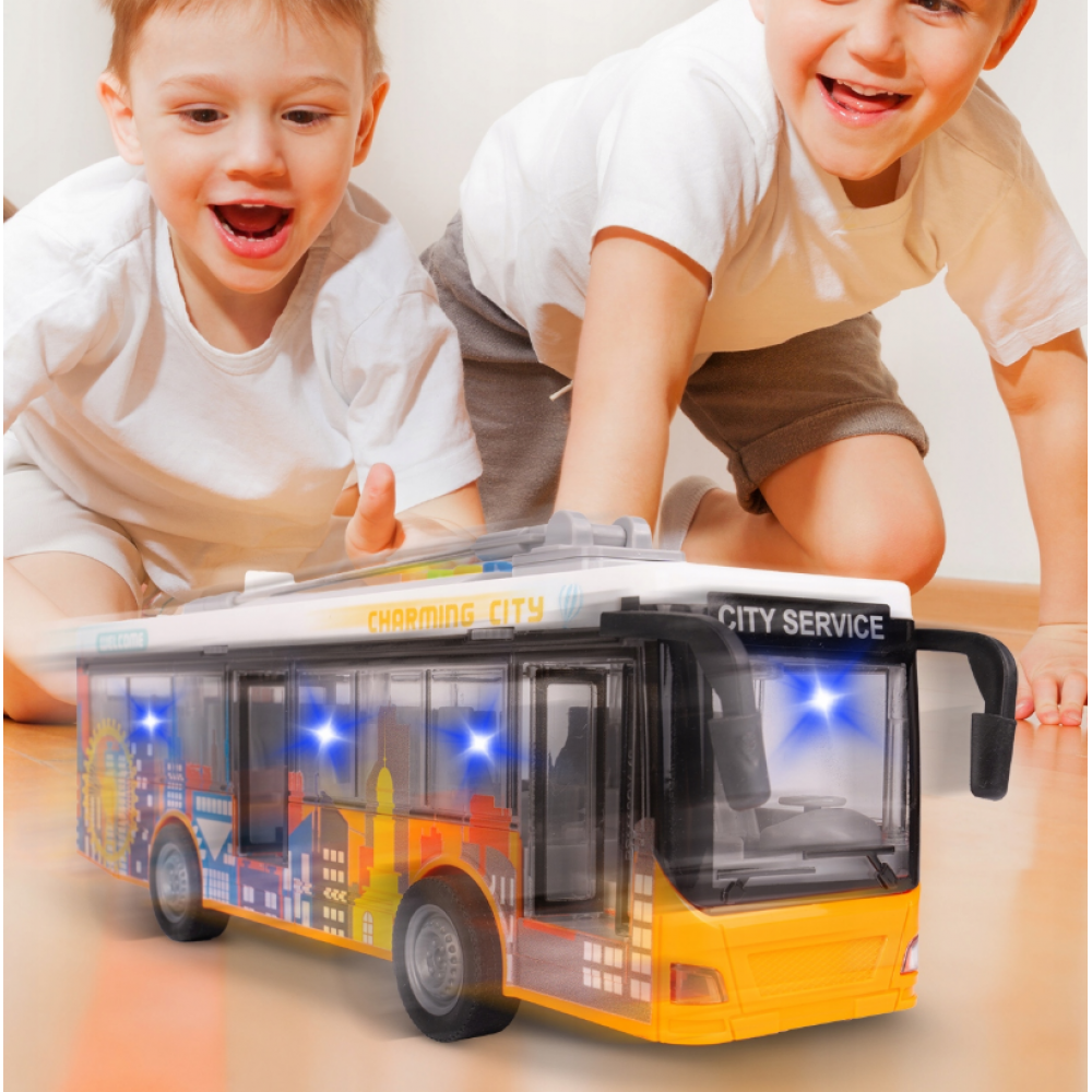 Игрушка использует фрикционный механизм: просто толкните автобус вперёд, и он начнёт двигаться сам. Она идеально подходит для детей, которые любят активные игры и динамичные сценарии, не требующие пульта дистанционного управления или электричества .