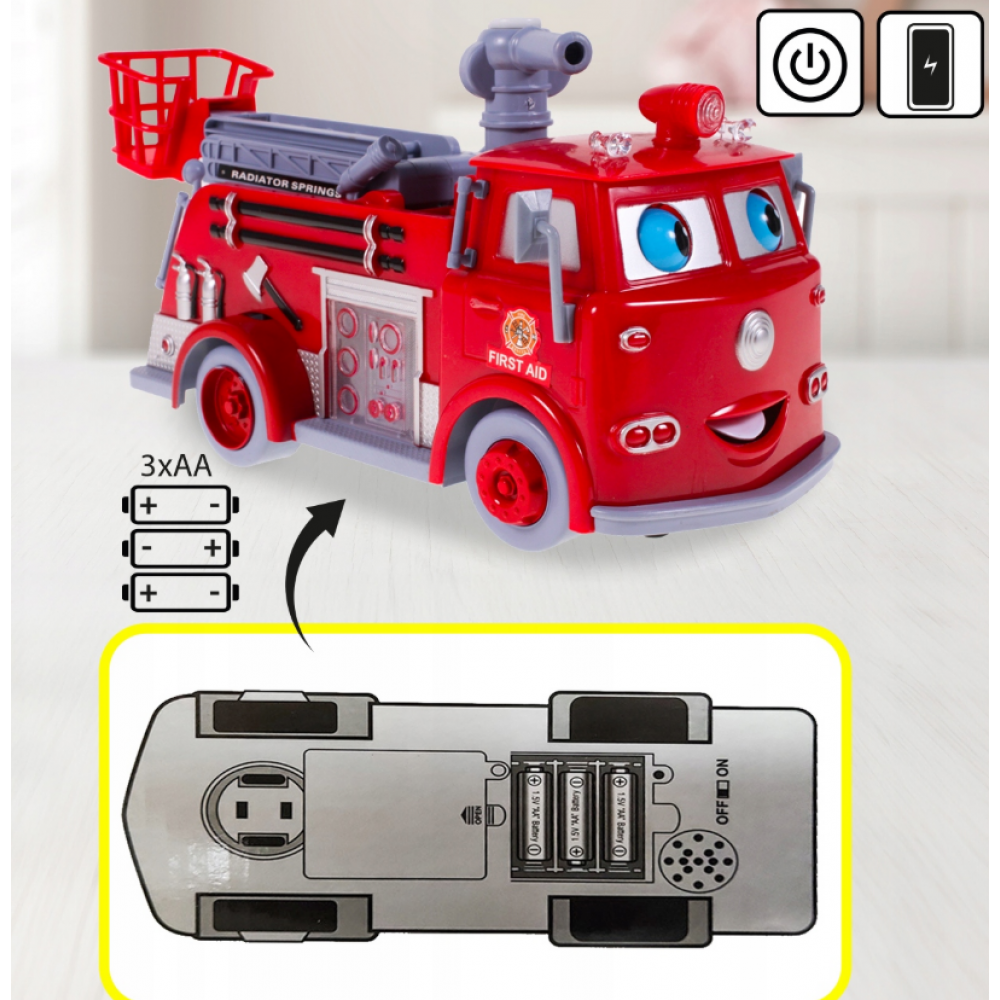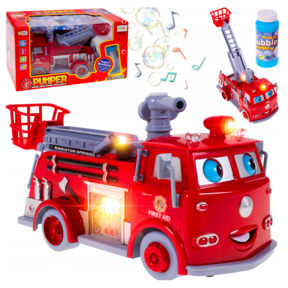 Машинка двигает глазами и языком во время движения, поднимает и опускает лестницу (выдвигается вручную). Она оснащена подвижной пушкой, выпускающей мыльные пузыри.