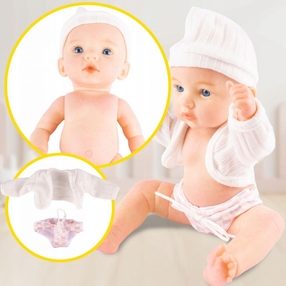 Кукла продаётся в полном комплекте: шапочка, свитер и подгузник . Все детали можно снимать и прикреплять обратно, что стимулирует творческую игру, развивает мелкую моторику и учит ухаживать за «ребёнком».