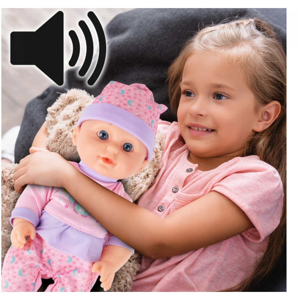 Это интерактивная кукла, которая издает различные звуки, в том числе: говорит «мама», «папа», смеется, плачет, лепечет.