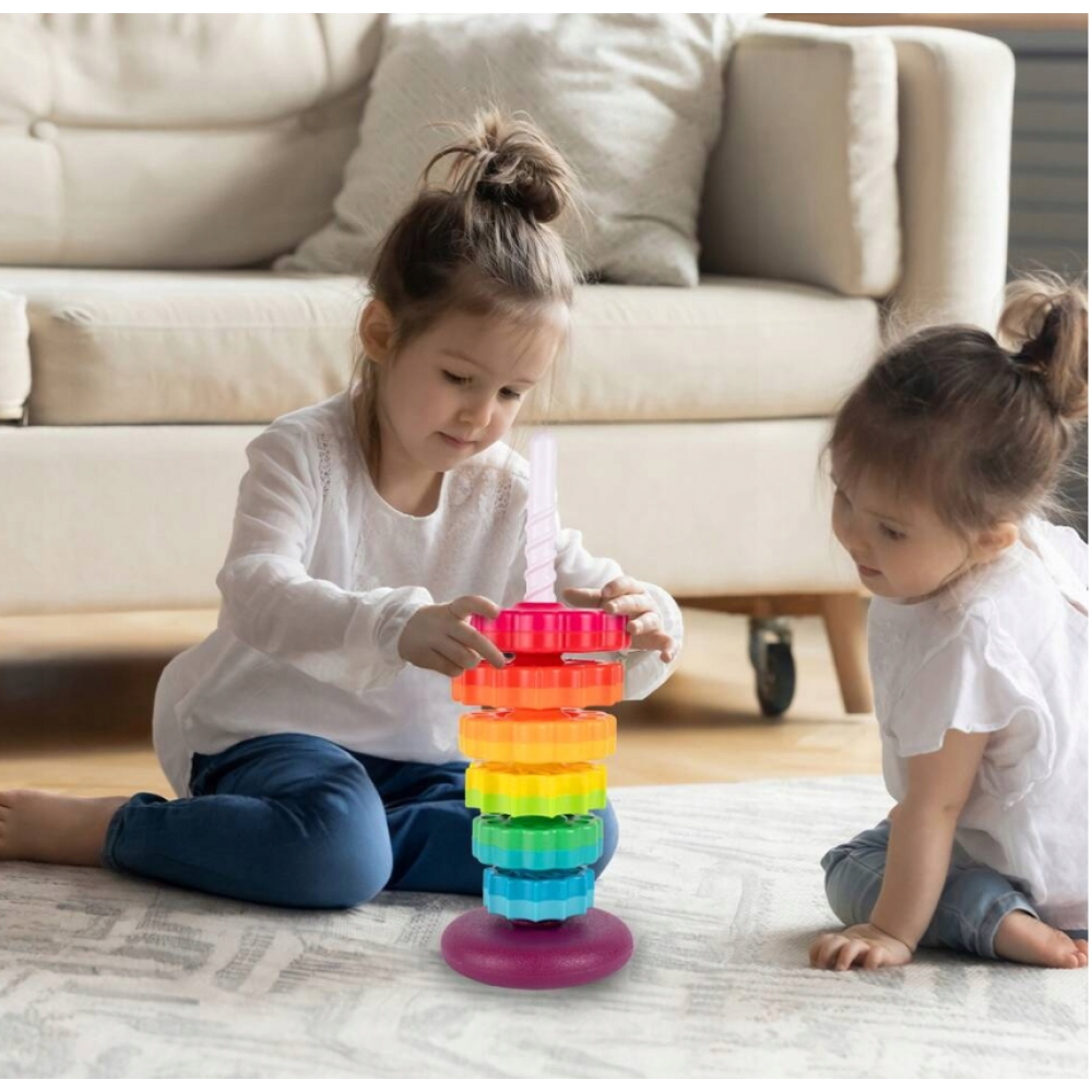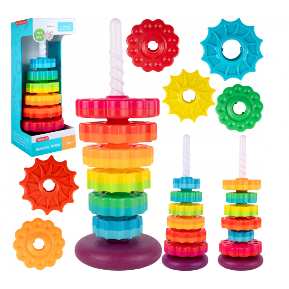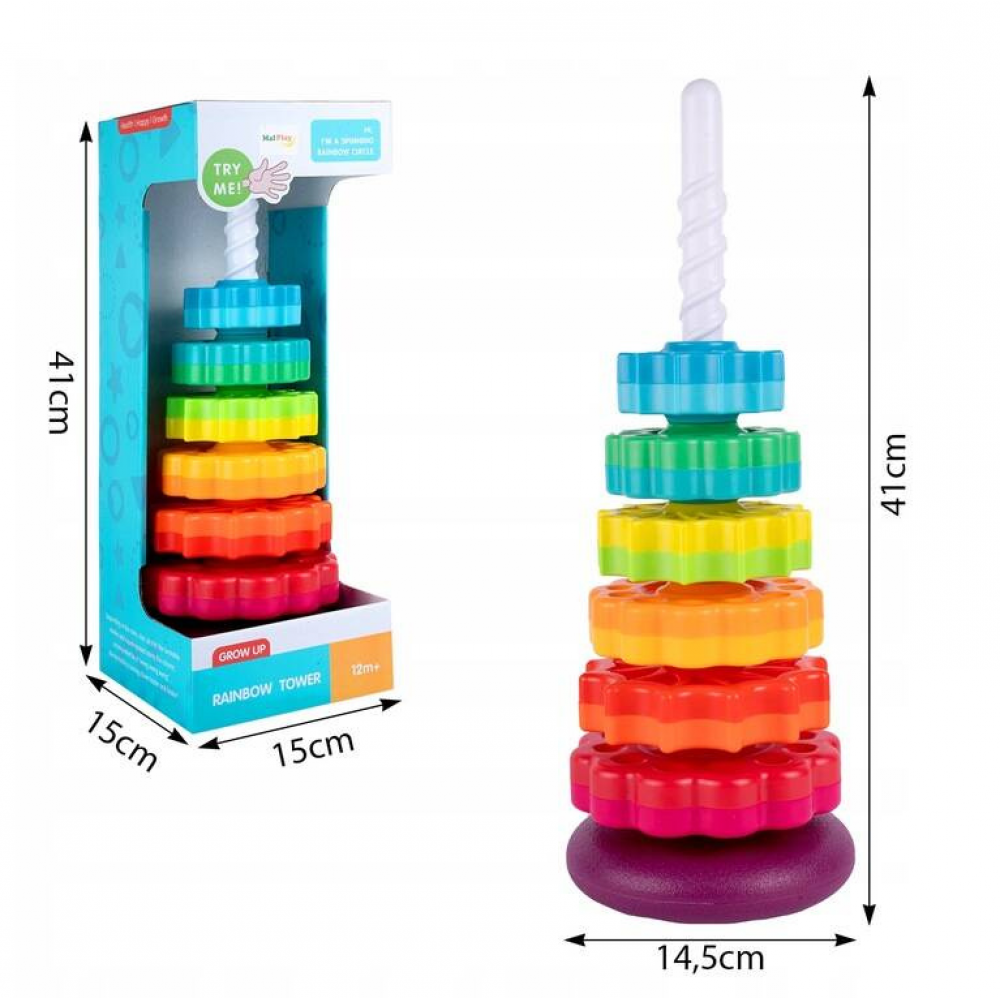 Пирамида состоит из шести радужных двухцветных дисков различной формы, которые, будучи помещены на столб, вращаются как гайка на винте. Помимо размещения дисков на столбе и наблюдения за их спиральным движением, в игру можно наслаждаться многими другими способами. Устанавливая диски, вы можете выдвинуть колонну из основания, чтобы увидеть, как все диски падают на землю. Вы можете складывать их друг на друга, считать или сортировать по цвету, форме или размеру. ИЗУЧЕНИЕ ЦВЕТОВ И ФОРМ - Каждая шестеренка имеет свой цвет, что позволяет вашему малышу не только играть, но и исследовать разнообразие цветов. РАЗВИТИЕ ВООБРАЖЕНИЯ - Вращая и располагая шестеренки в различных комбинациях, ваш малыш может представить себе бесконечные приключения. Это прекрасная возможность для творческой игры и воображения.