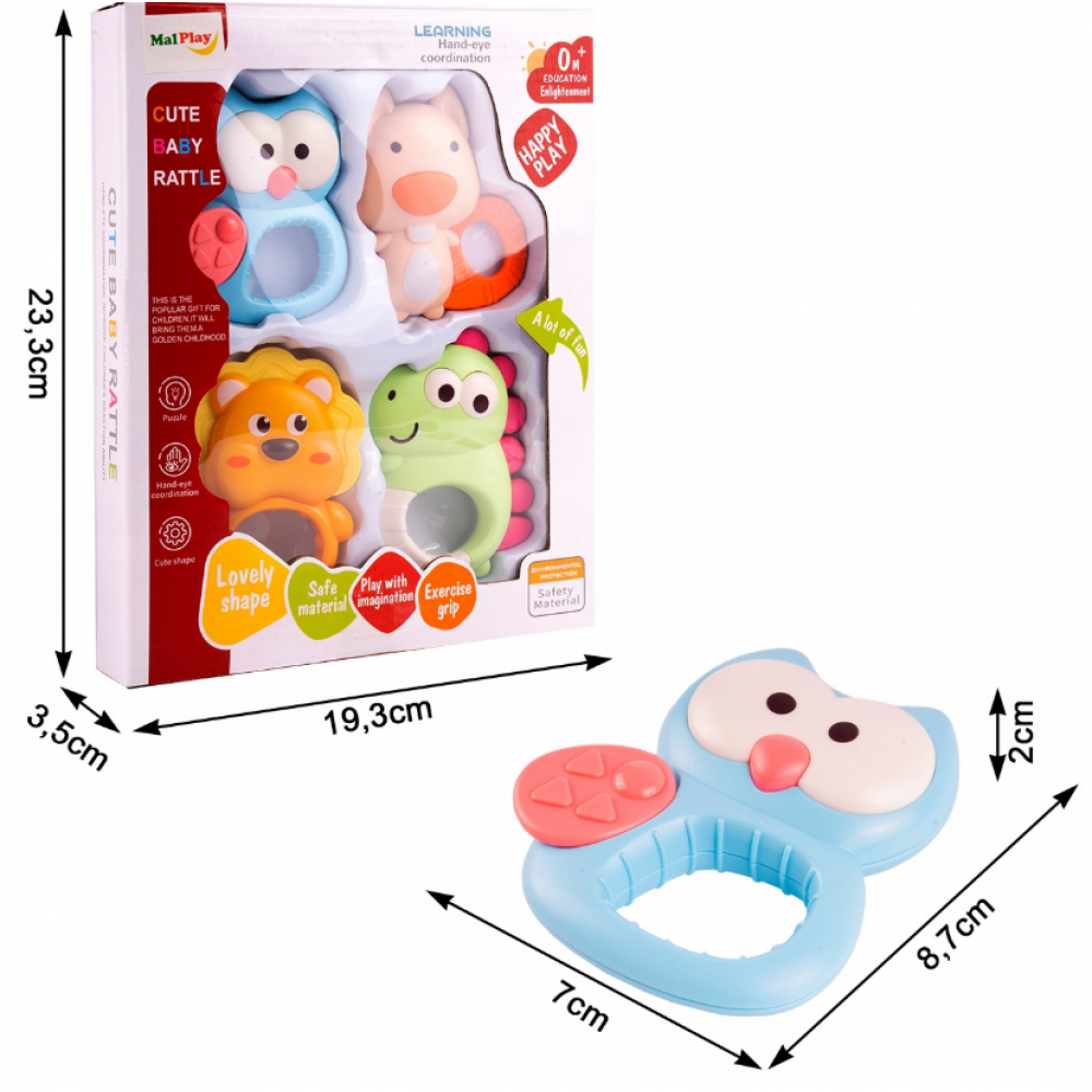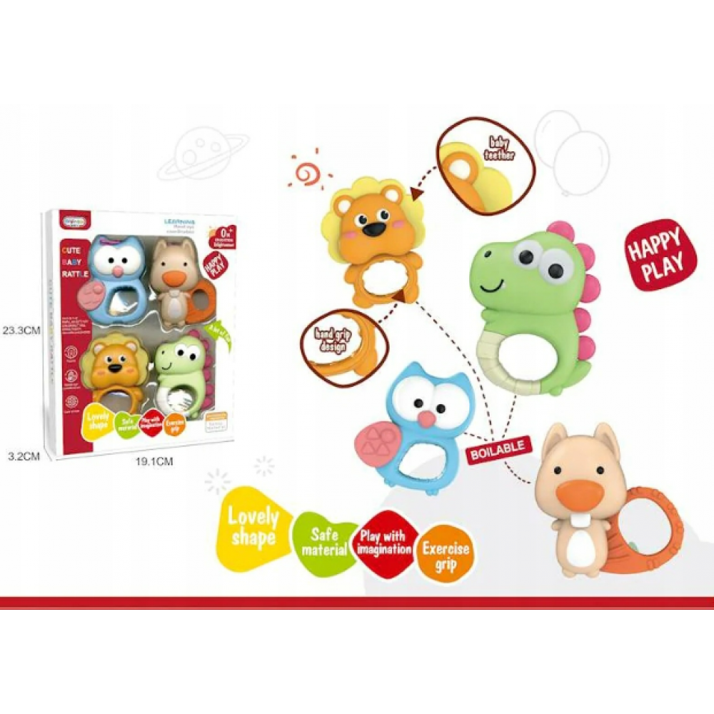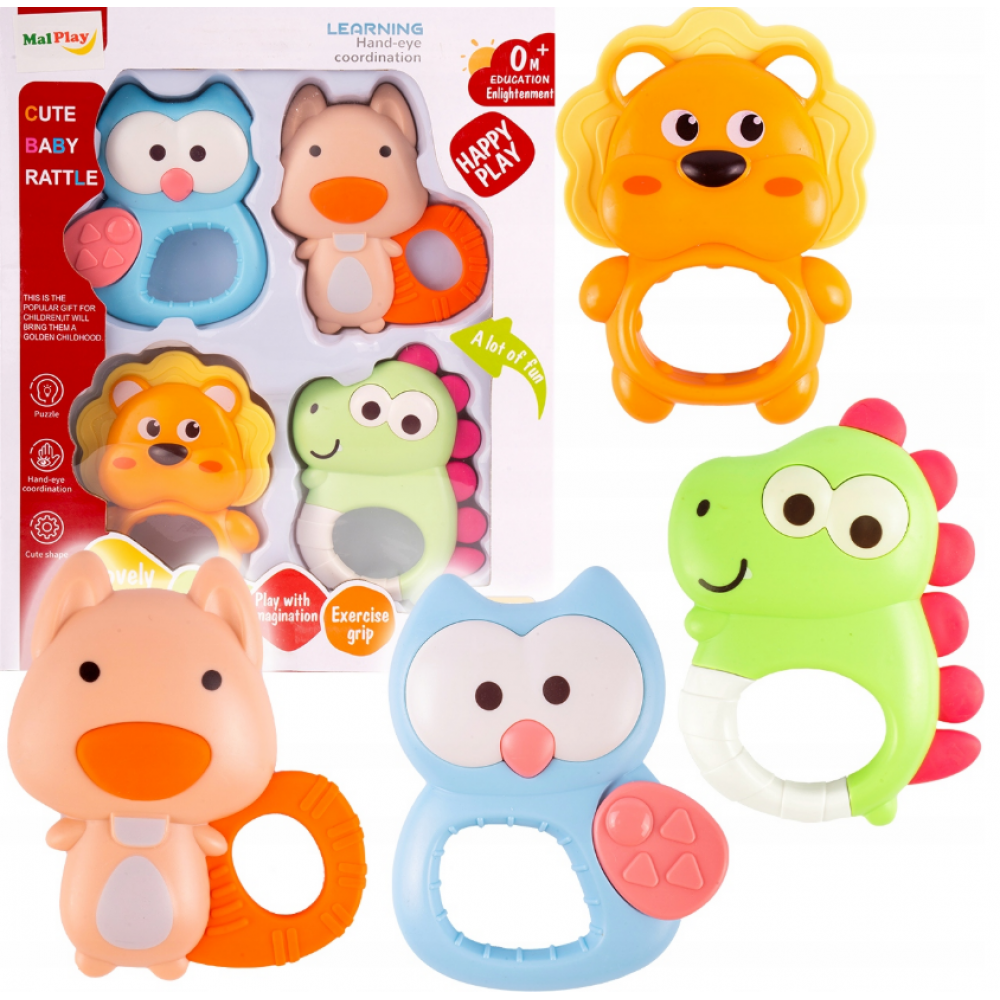 - 4 погремушки/прорезыватели: ЛЕВ, СОВА, ДИНО, ЛИСА