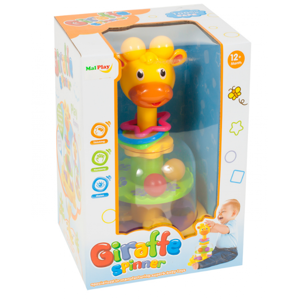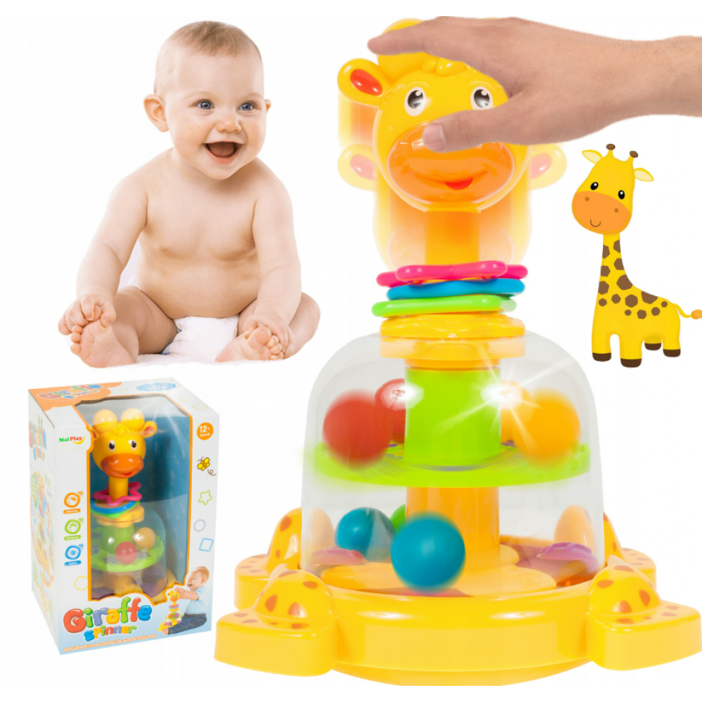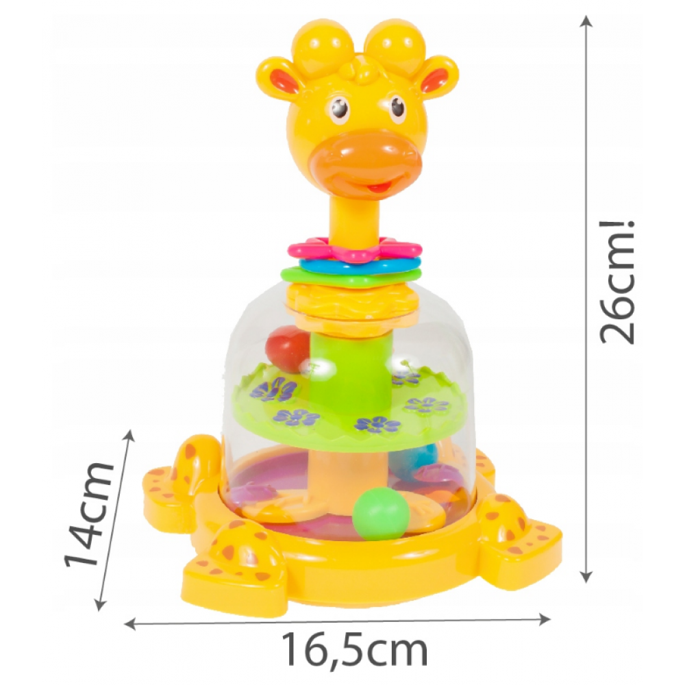 Классическая игрушка для малышей с разноцветным жирафом! Нажмите на голову жирафа и наблюдайте, как шарики подпрыгивают и попадают в нужные точки на его животе!