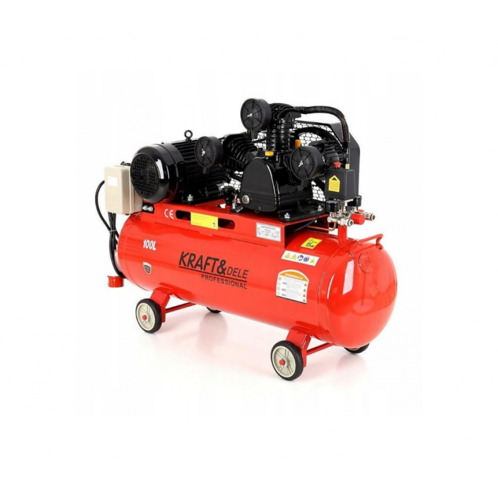Kraft&Dele kompresors ir čuguna, ar eļļu eļļots kompresors, kas uzstādīts uz 100 litru tvertnes.