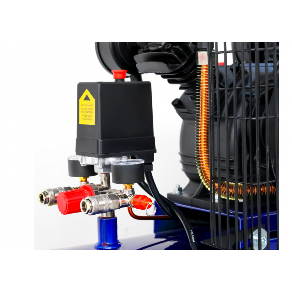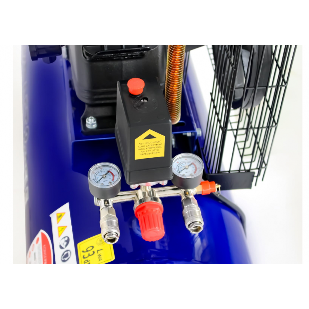 Ierīce ir aprīkota ar dubultu spiediena slēdzi ar manometriem, kas ļauj kontrolēt spiedienu katrā darba izejā, iztukšošanas vārstu kondensāta novadīšanai un lieliem transportēšanas riteņiem ērtai pārvietošanai.