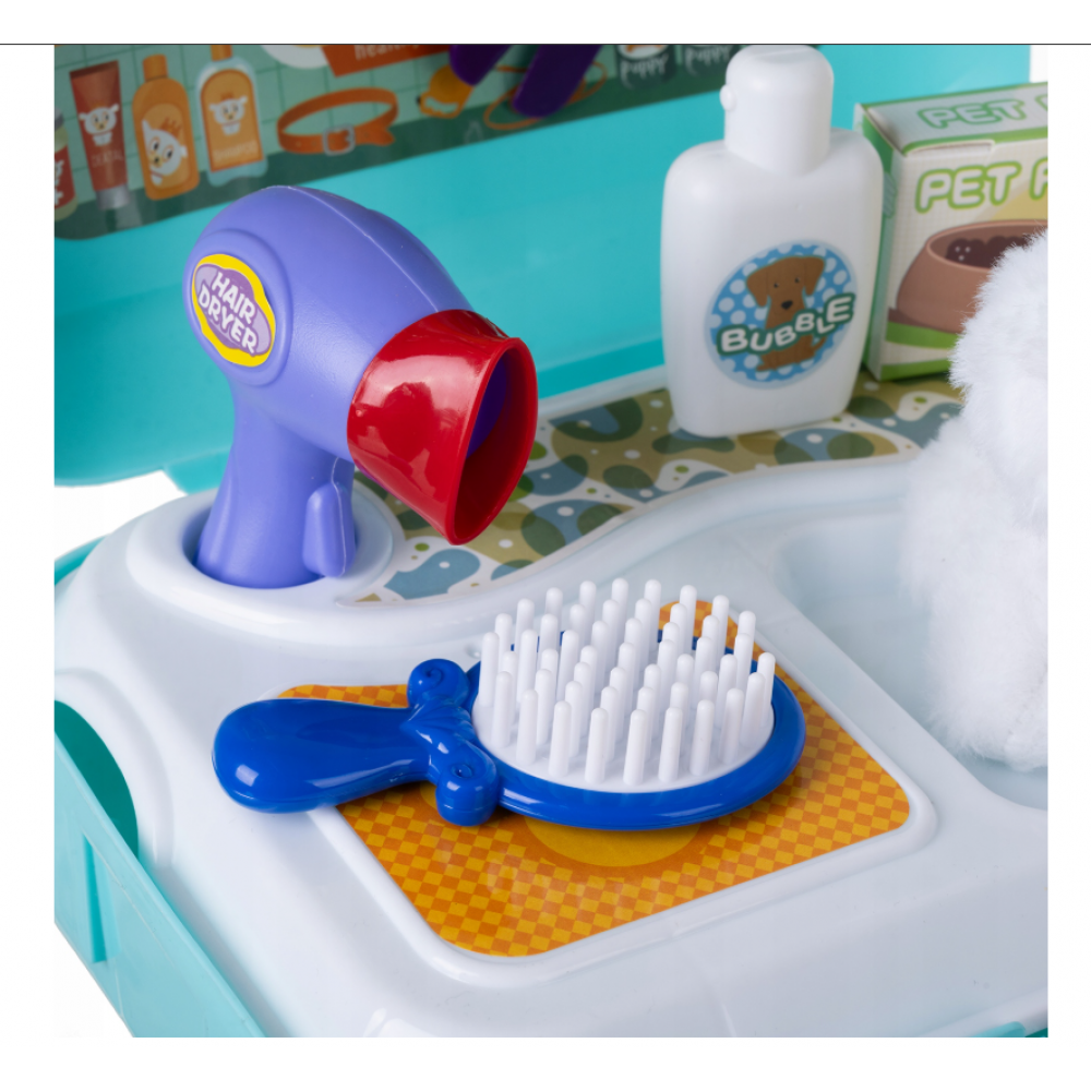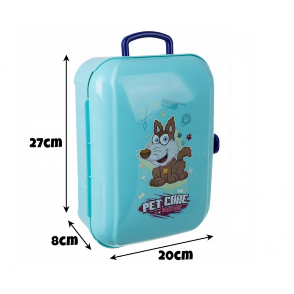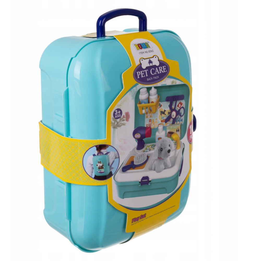 Suņu kopšanas komplekts čemodānā ir lieliska rotaļlieta jebkuram jaunam suņu entuziastam. Viņi var droši rūpēties par mīlīgu mazu kucēnu, kas gaida savu saimnieku. Komplektā ietilpst piederumi dzīvnieka apgriešanai, ķemmēšanai, vannošanai, žāvēšanai un barošanai. Viss komplekts ir ievietots nelielā, praktiskā mugursomā ar glabāšanas nodalījumu piederumu glabāšanai pēc spēles laika. Tam ir regulējamas siksnas, ērts rokturis un aizdare, lai rotaļlietas droši noturētu čemodānā.