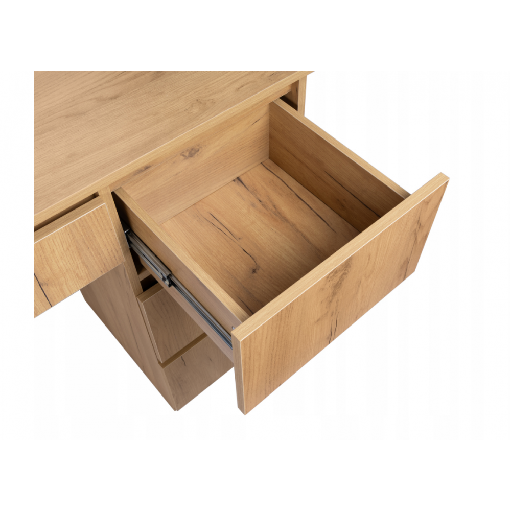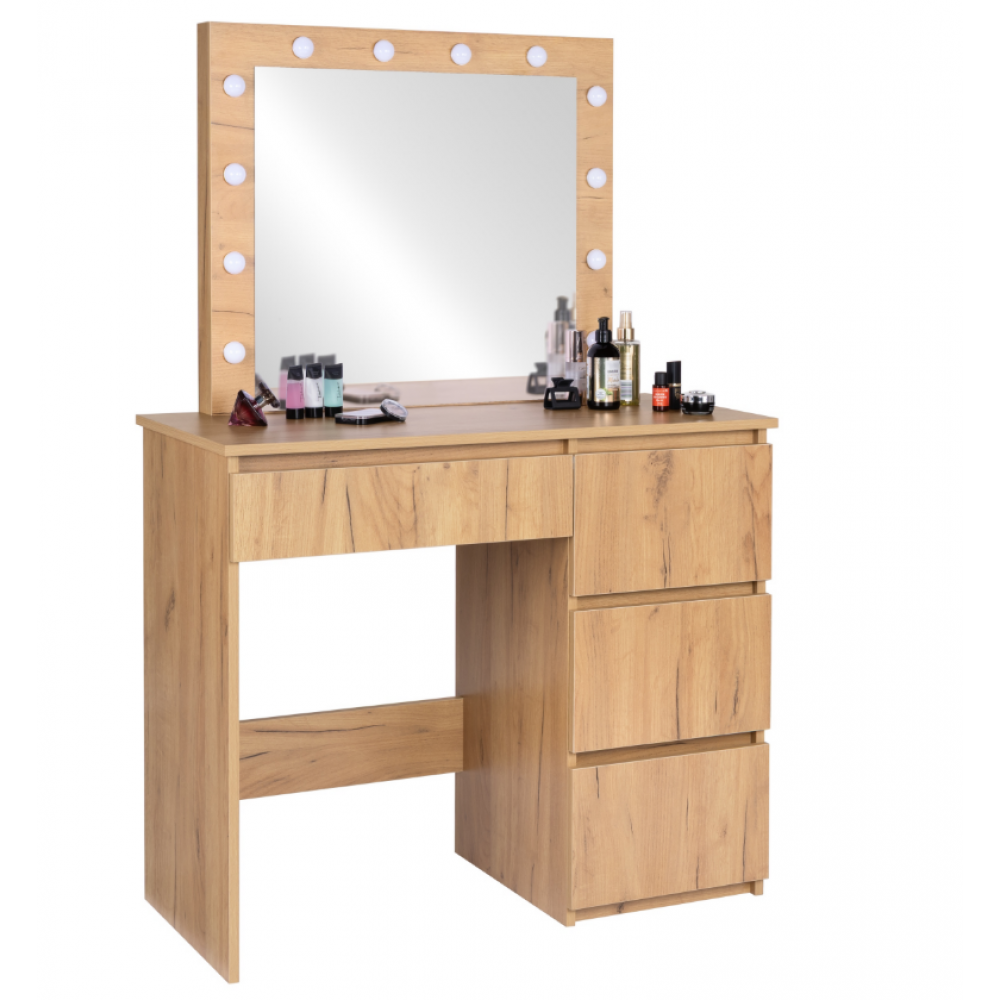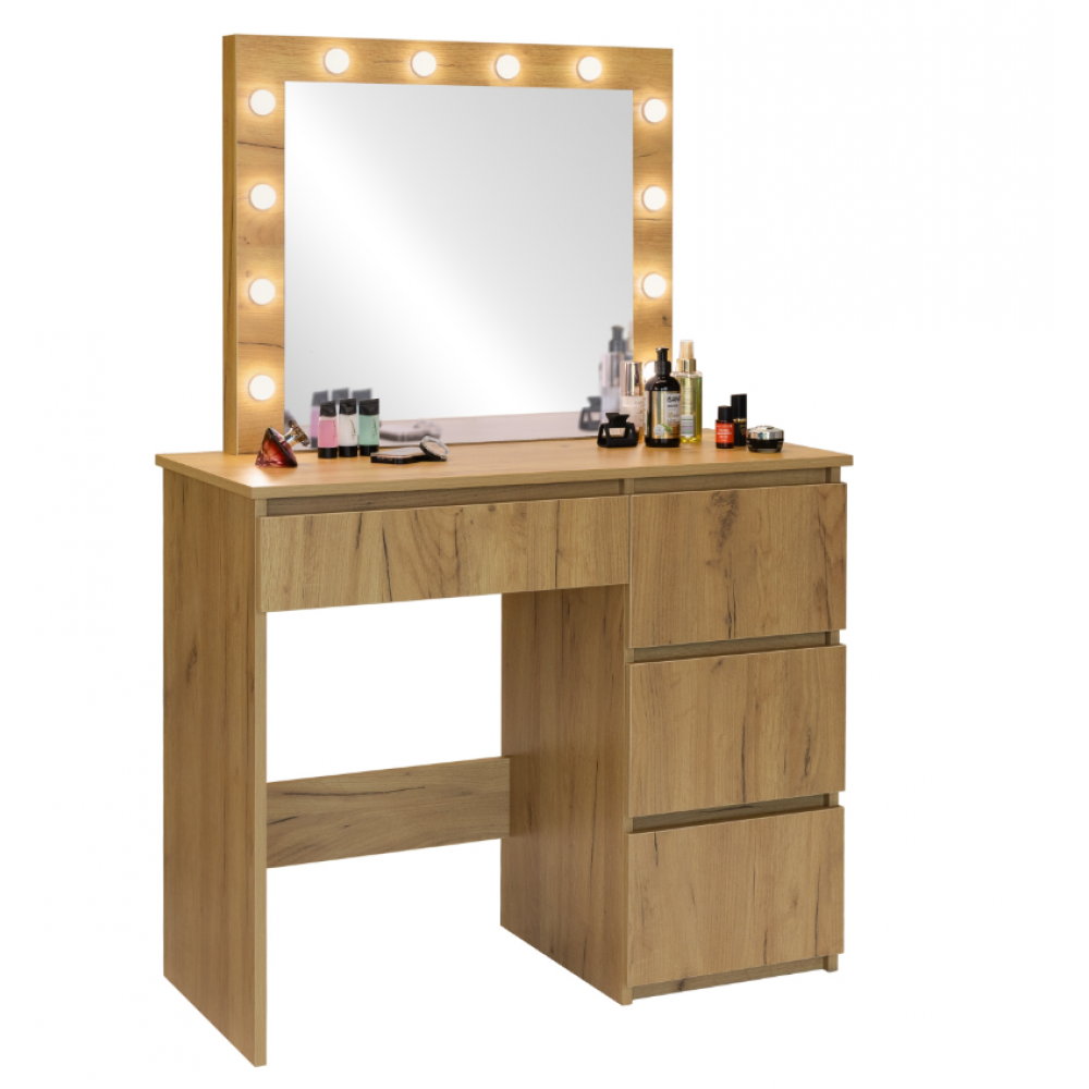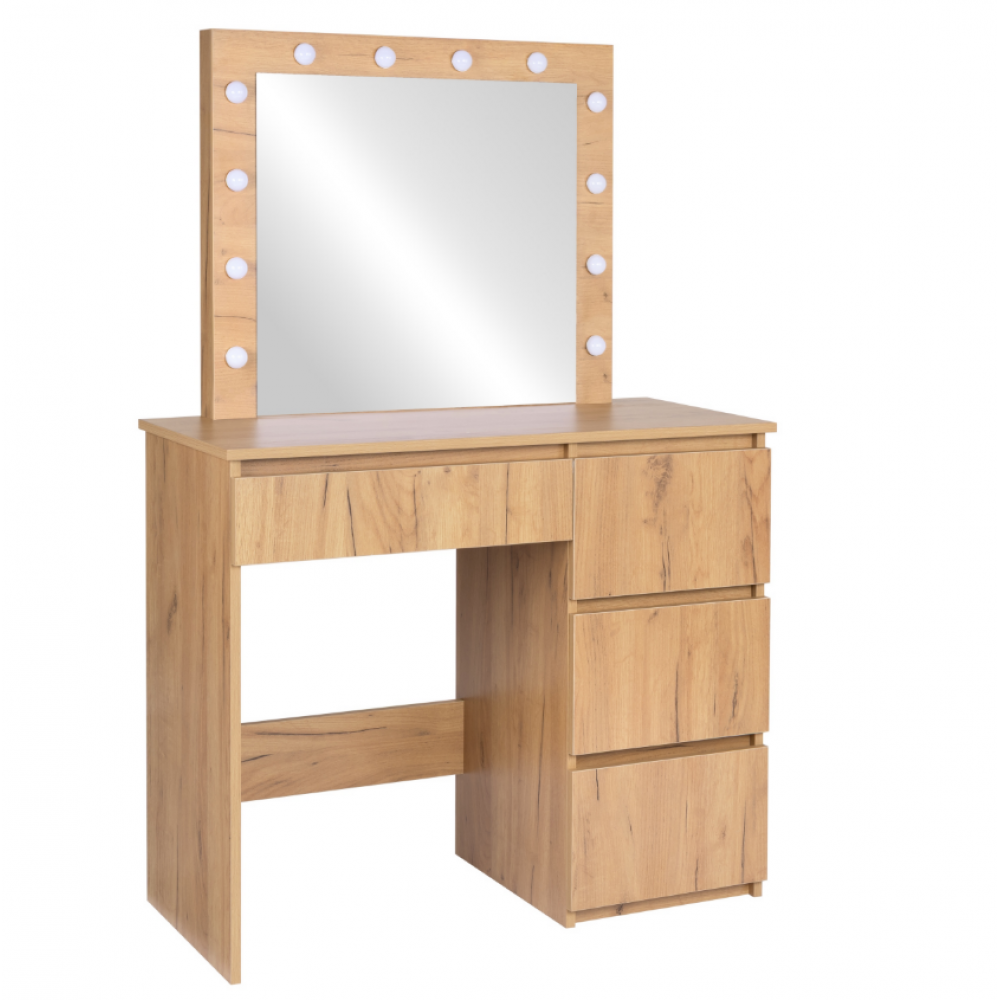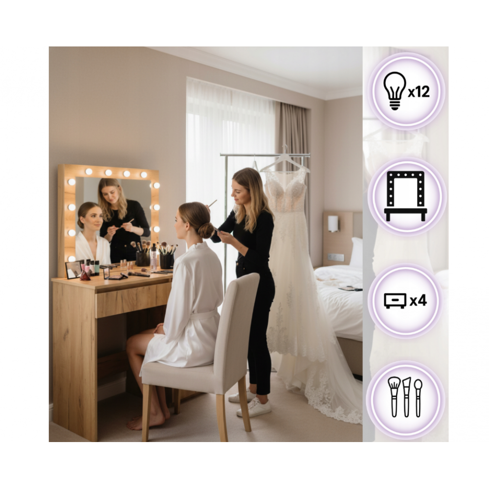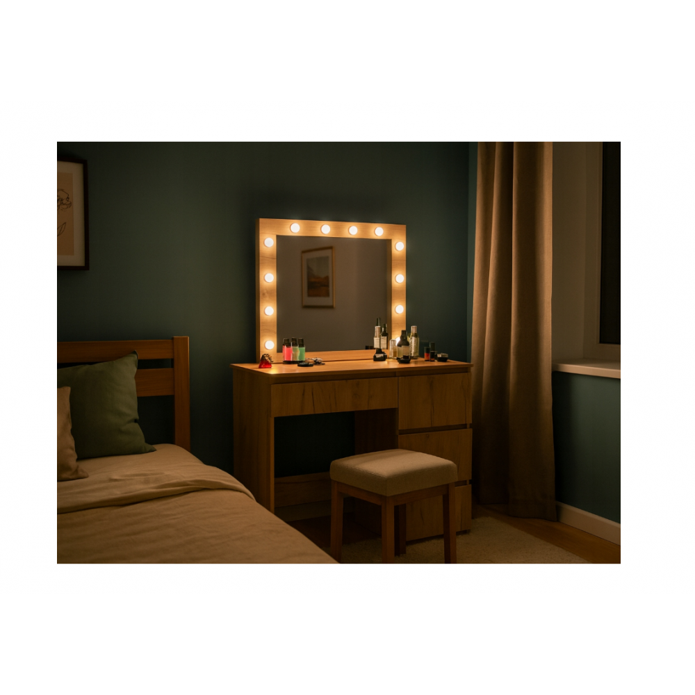 Šis LED tualetes galdiņš ar spoguli ir stilīgs un funkcionāls mēbeles elements, kas ir ideāli piemērots guļamistabai vai ģērbtuvei. Tam ir liels spogulis ar spuldzēm, kas izvietotas ap rāmi, nodrošinot perfektu vidi grimam un ādas kopšanai. Četrās ietilpīgās atvilktnēs var glabāt visu jūsu kosmētiku, aksesuārus un rotaslietas, nodrošinot ikdienas lietu kārtību. Izturīgā, dabiskās krāsas konstrukcija piešķir tam elegantu un mūžīgu raksturu. Tualetes galdiņš apvieno dizainu, funkcionalitāti un komfortu , radot perfektu vietu jūsu ikdienas skaistumkopšanas rituāliem.