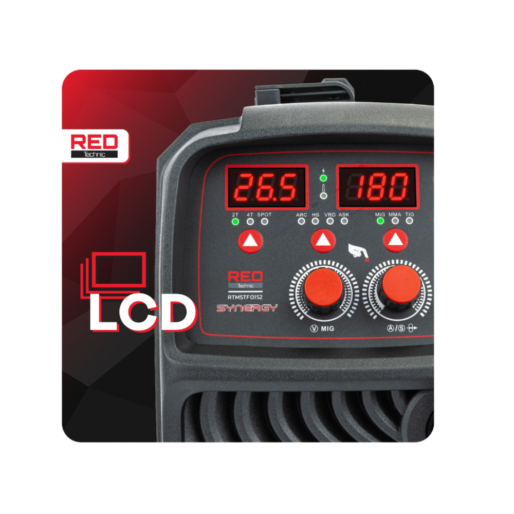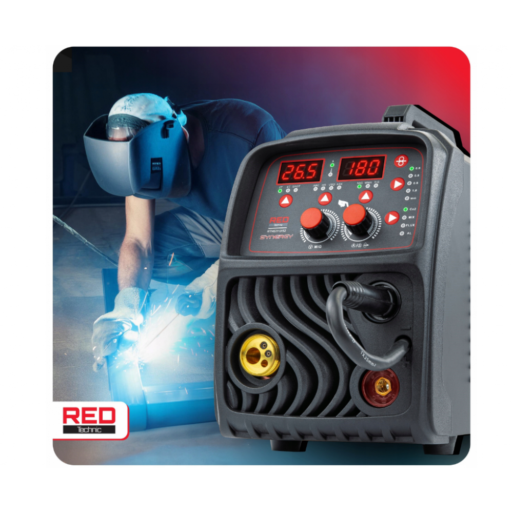 RED Technic invertora MIG metināšanas iekārta ir kompakta, pusautomātiska metināšanas iekārta ar IGBT tehnoloģiju un sinerģijas funkciju, kas nodrošina MIG/MAG, MMA un LIFT-TIG metināšanu. Aprīkota ar skaidru LCD paneli, HOT START, ANTI STICK, ARC FORCE un VRD funkcijām, kā arī divu ruļļu stieples padevi, tā nodrošina ērtu lietošanu, augstu metināšanas kvalitāti un 60% efektivitāti. Ideāli piemērota nerūsējošā tērauda, alumīnija un darba apstākļiem.