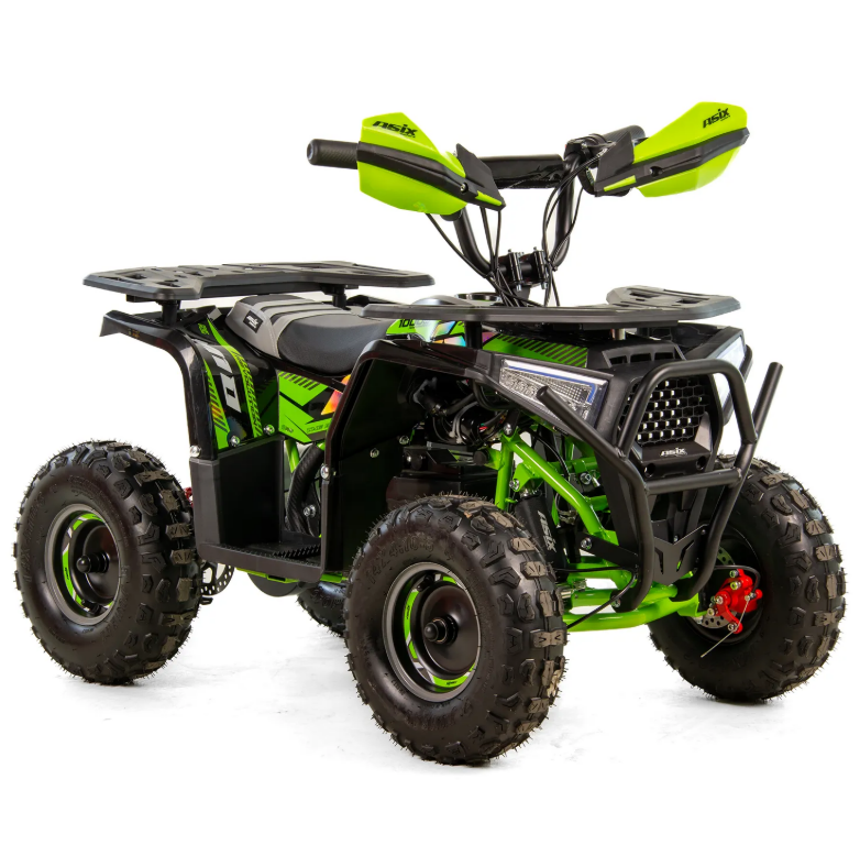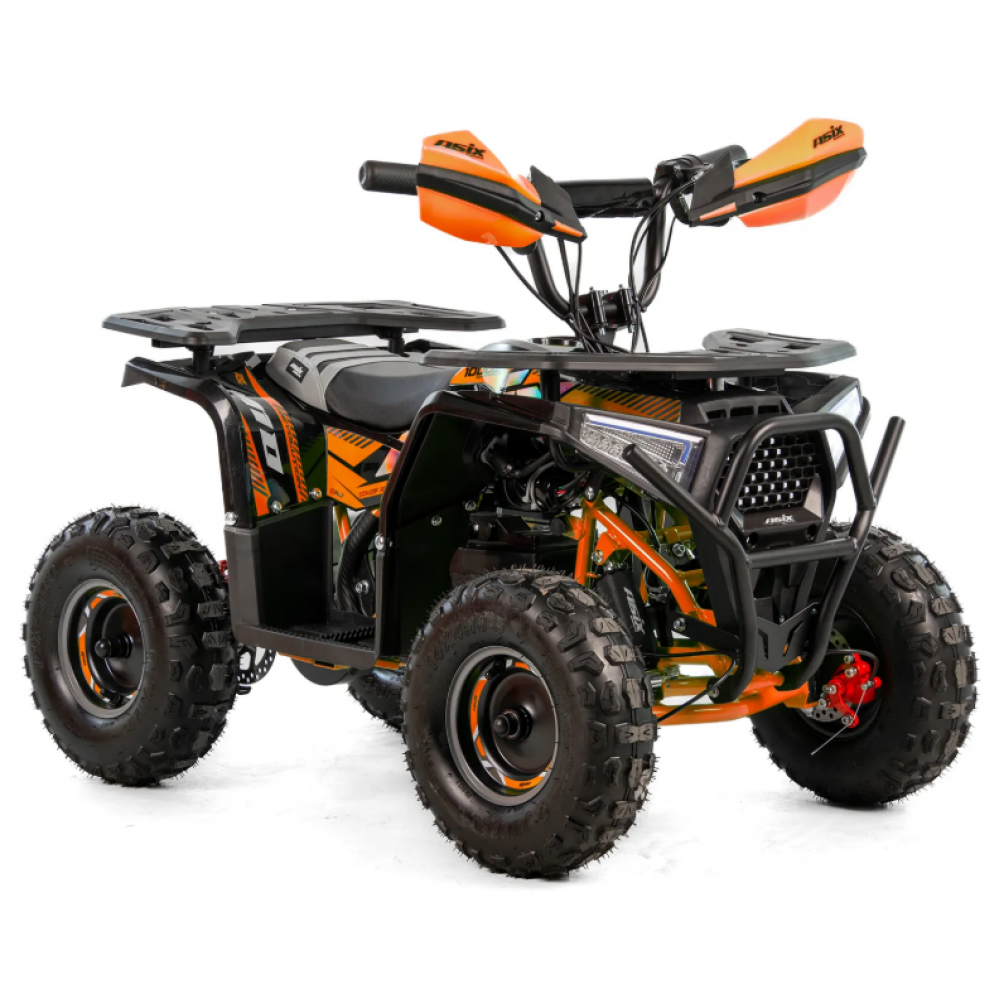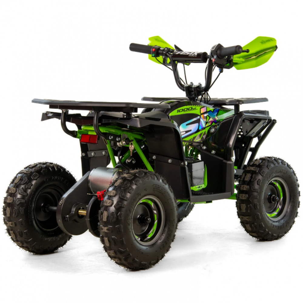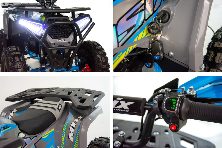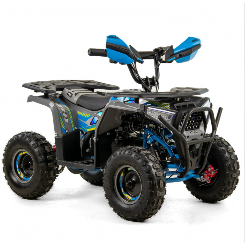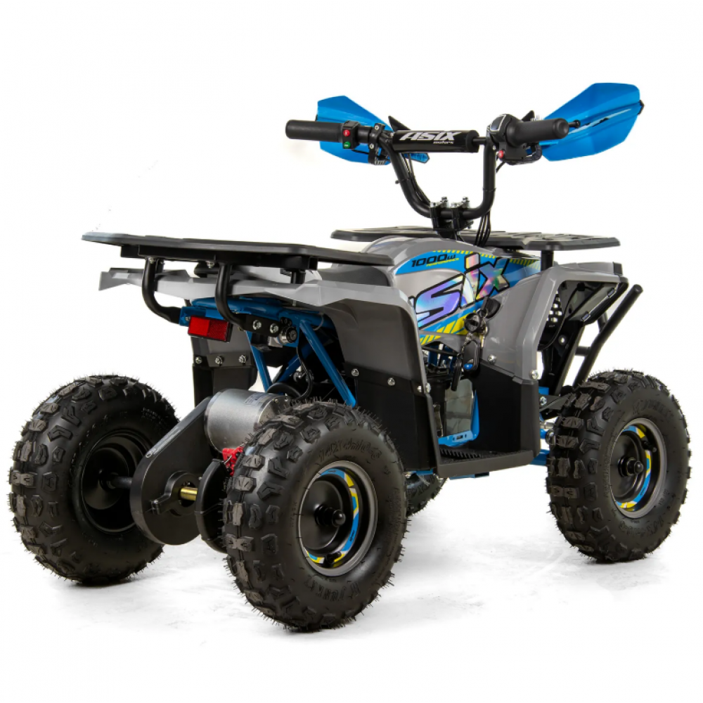 ASIX E-M10 mini kvadraciklu darbina 1000 W bezsuku elektromotors. Transportlīdzeklim ir 3 ātrumu ātruma kontrole ar atslēgas palīdzību darbināmu aizdedzi. Šis apvidus kvadracikls ar atpakaļgaitas pārnesumu ir piemērots bērniem vecumā no 3 līdz 8 gadiem. Tas brauc uz lieliem 6 collu riteņiem un ir aprīkots ar priekšējo LED apgaismojumu, margām, priekšējiem un aizmugurējiem bagāžniekiem ar īpašiem pārsegiem un skaņas signālu.