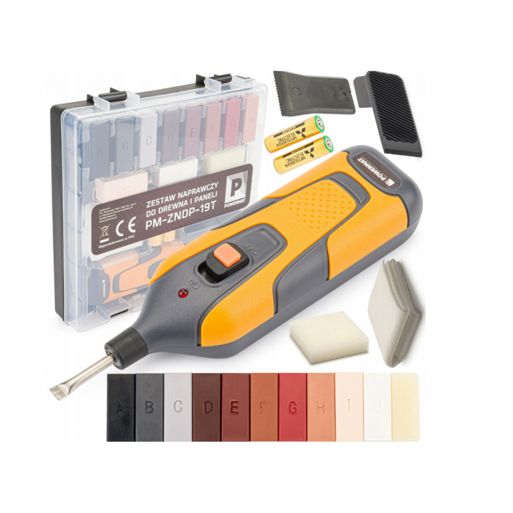 Šis POWERMAT komplekts ļauj jums pašam salabot koka un kokam līdzīgu virsmu bojājumus . Tas var salabot arī akmens un keramikas virsmu bojājumus atkarībā no vēlamās špakteles krāsas. Komplektā iekļautais vasks salabo dziļas skrambas, plaisas, urbtus caurumus, nobrāzumus un šķembas. Vienpadsmit vaska stienīši dažādās krāsās ļauj izvēlēties pareizo toni. Vaskus var sajaukt , lai iegūtu vēlamo toni. Uzkarsētais vasks aizpilda spraugu un, nožuvis, sacietē, izveidojot aizsargslāni.