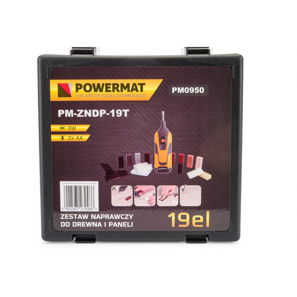 Kompaktais POWERMAT logu, durvju un koka grīdu remonta komplekts ļauj ātri un neatgriezeniski noņemt gan seklas, gan dziļākas skrambas un caurumus, salabot bojātus stūrus un malas, kā arī iespiedumus — gan uz dekoratīvām, gan koka virsmām. Tas ir ideāli piemērots lokālam remontam. Komplektā ir iekļauti visi remontam nepieciešamie instrumenti.