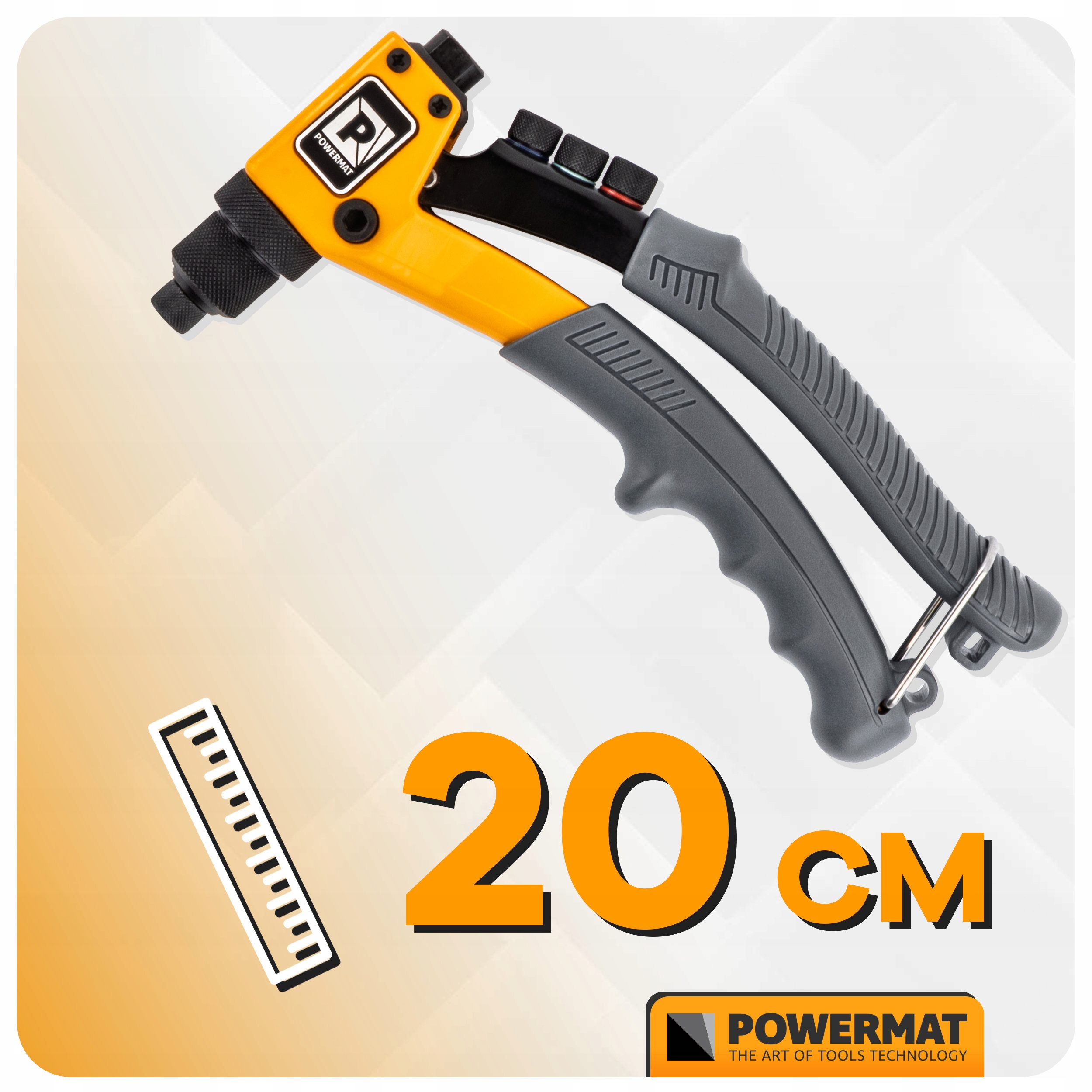 Turklāt izmēri 20 × 11 × 3 cm nodrošina precīzu uzgaļa novietojumu uz kniedētās virsmas un stabilu vadību pievilkšanas laikā.