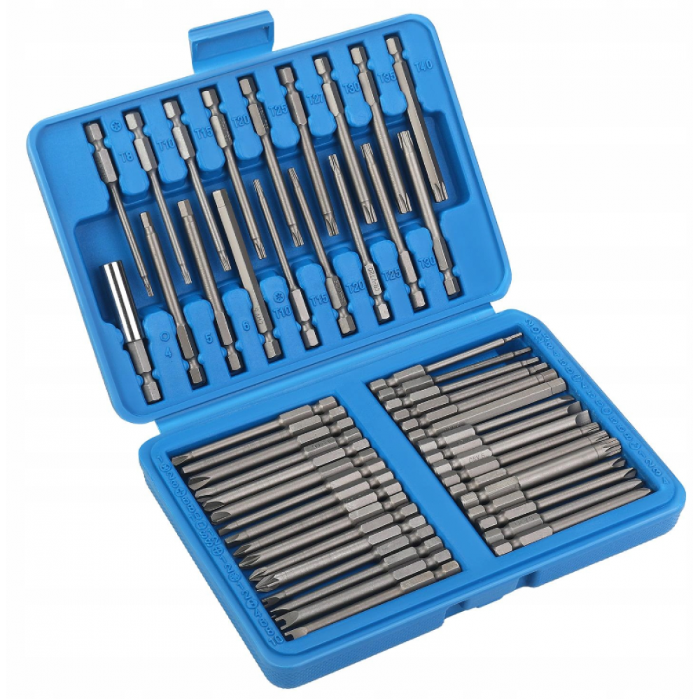 - ⚙️ Типы бит: Torx, Torx с отверстием, муфта, набор Torq, шлицевые, трехгранные, квадратные, двухштырьковые, плоские, Phillips, Pozidriv, шестигранные с отверстием, шестигранные