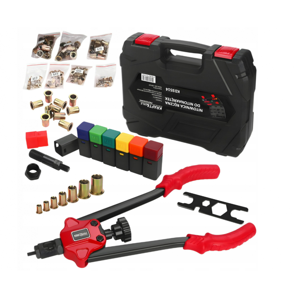 Этот профессиональный набор заклёпочных гаек включает в себя ручной заклёпочный инструмент (KD3514) и полный набор принадлежностей, обеспечивающих прочные и надёжные соединения с использованием заклёпочных гаек размером от M3 до M12 . Это идеальный инструмент для сервисных работ, кузовных работ, строительства и мастерских, где требуется нарезать внутреннюю резьбу в тонких материалах. Весь набор аккуратно организован и поставляется в практичном кейсе .