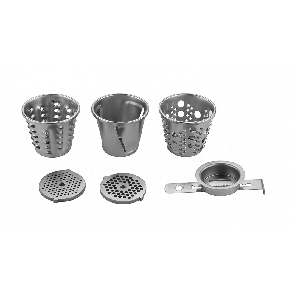 ✅ Bagātīgs piederumu komplekts, kas ļauj malt, spiest sulu, griezt un veidot pārtiku