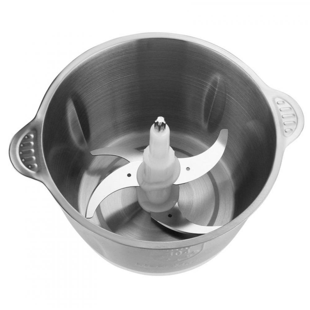 - Komplekta saturs: elektriskais smalcinātājs, 2 litru bļoda, nerūsējošā tērauda asmeņu komplekts, vāks ar drošības mehānismu