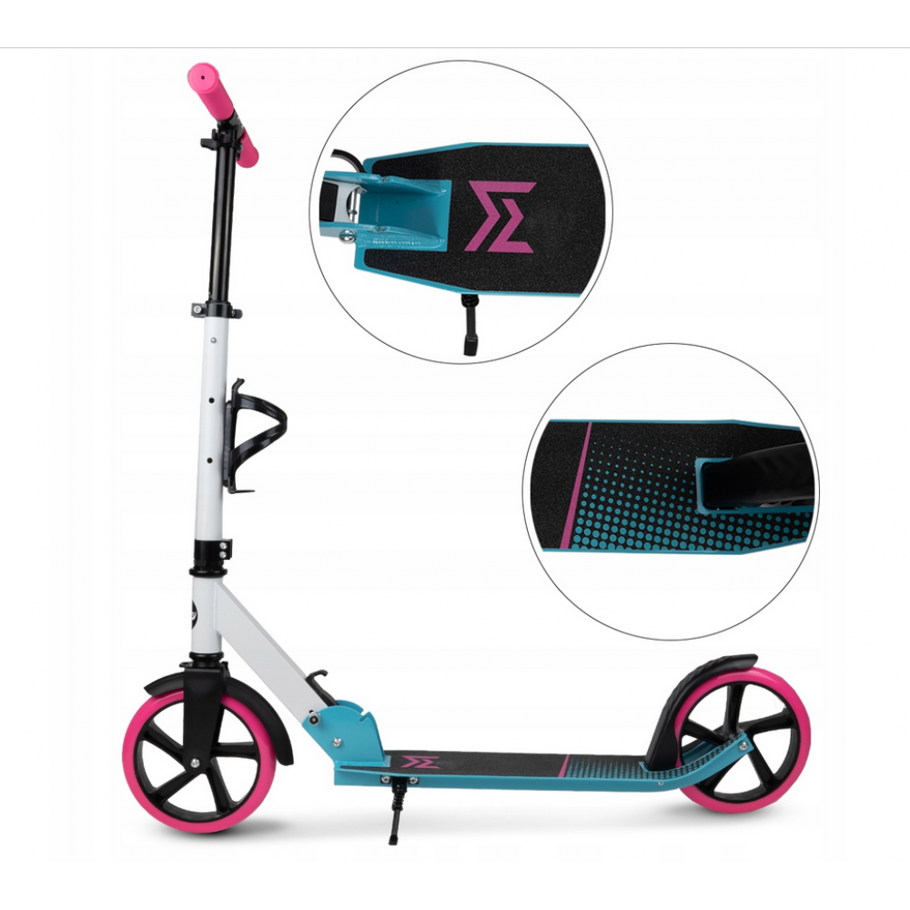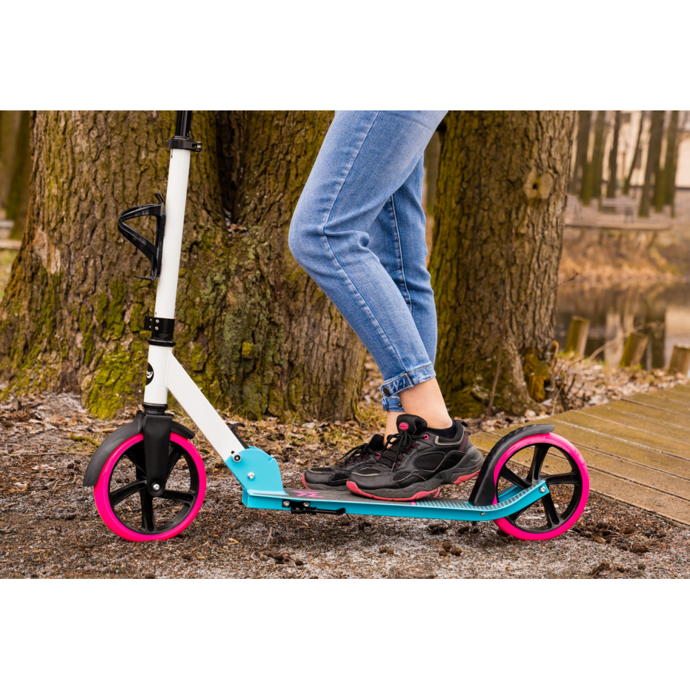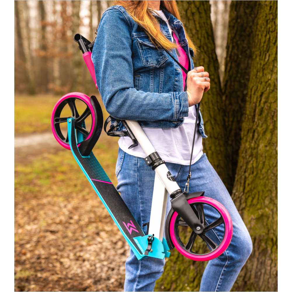 - Salokāms skrejritenis lieliem pilsētas riteņiem ar regulējamām bremzēm 200 mm, 100 kg, ABEC-7, krāsa balta, zila, rozā