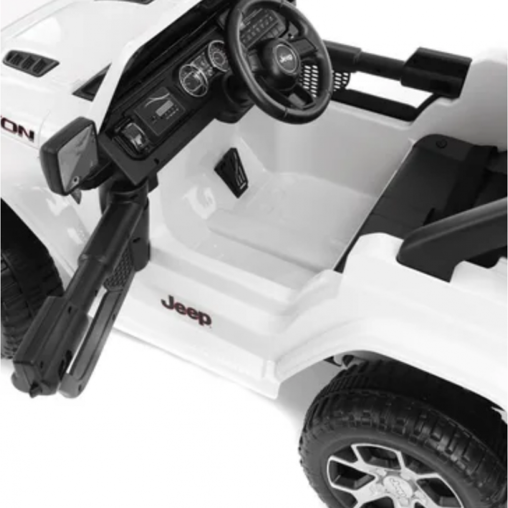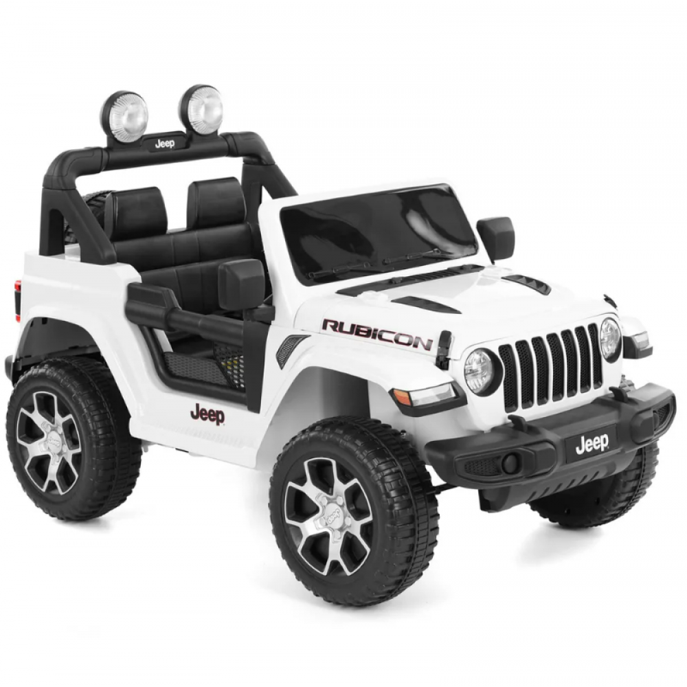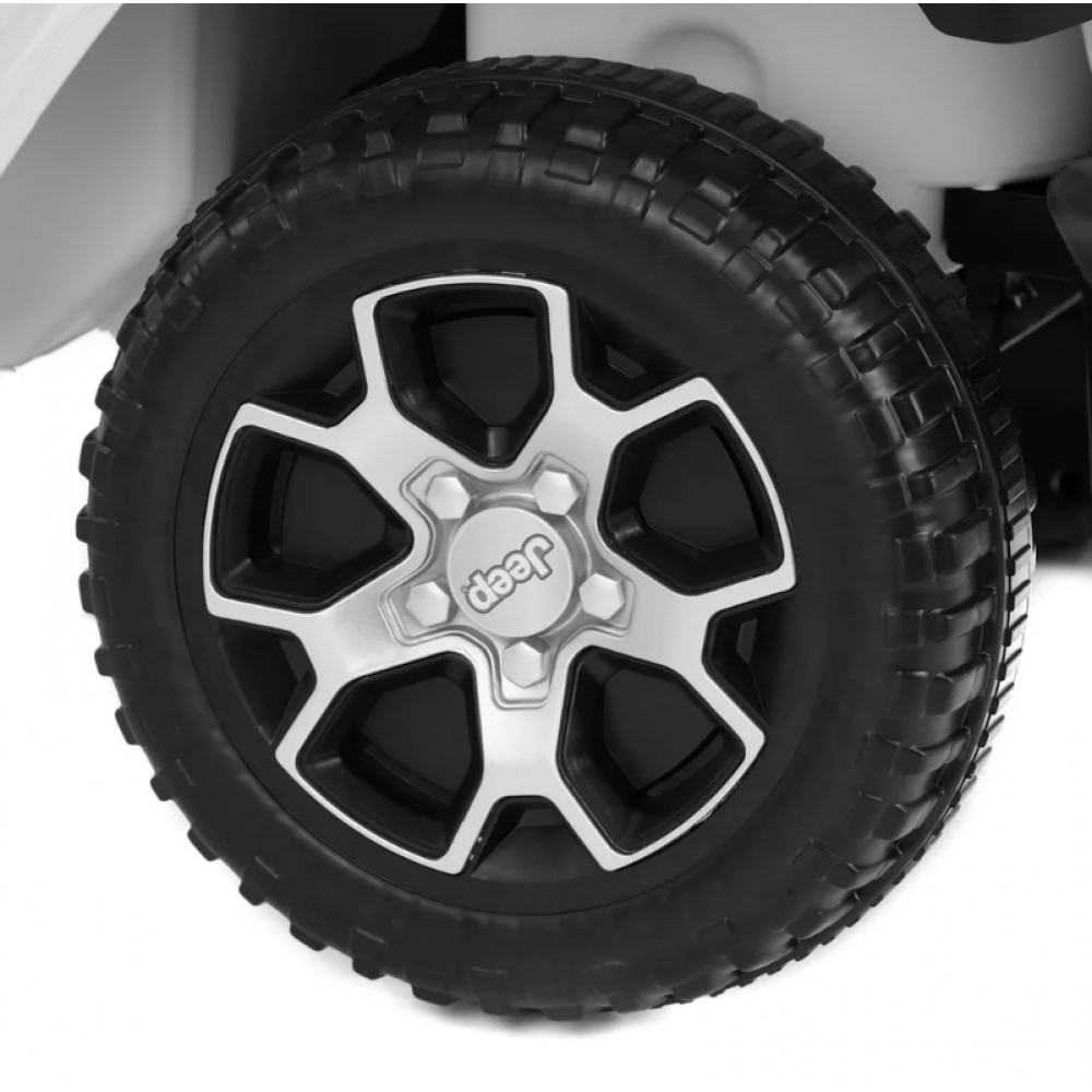 Ar akumulatoru darbināms Jeep Wrangler Rubicon braucamkrēsls baltā krāsā. Piemērots bērniem vecumā no 3 līdz 8 gadiem. Maksimālā slodze 35 kg. Akumulators 12 V, 10 Ah / 12 V, 2 x 35 W. 2 motori, skaņas un gaismas efekti, MP3, USB, SD. Oriģinālā Jeep Wrangler Rubicon licence.
