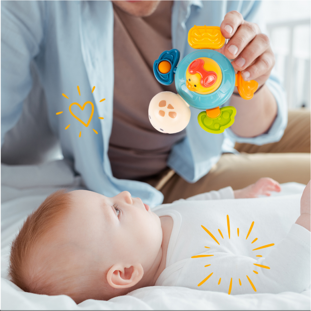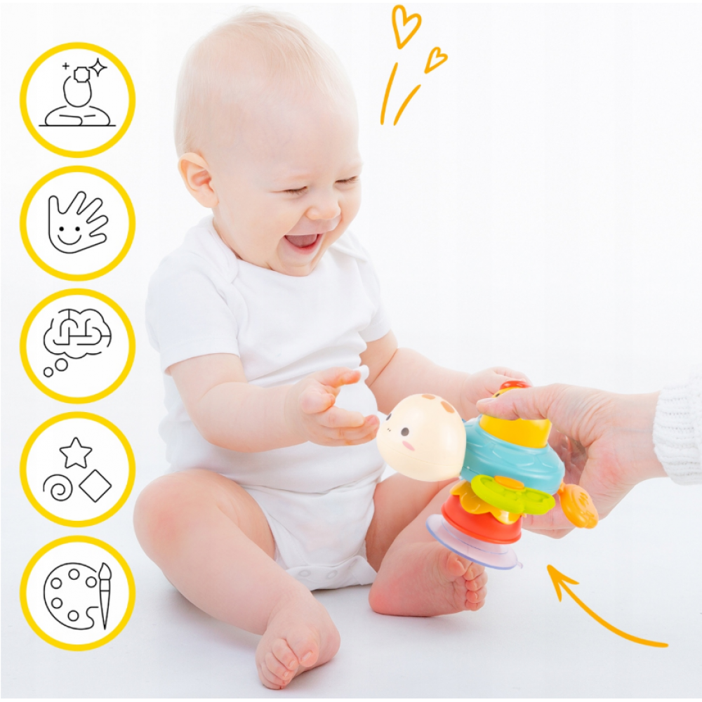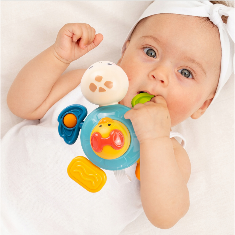 Sensorais bruņurupucis atbalsta bērnu attīstību, izmantojot dažādus stimulus . Krāsaini elementi stimulē redzi, dažādas tekstūras māca viņiem izpētīt pasauli ar taustes palīdzību, un kustīgā konstrukcija atbalsta roku-acu koordināciju. Bērni vingrinās satvert, pagriezt un izsekot rotaļlietas kustībai, kas pozitīvi ietekmē viņu psihomotoro attīstību .