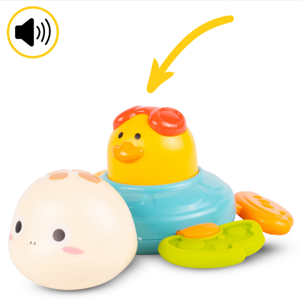 Nospiežot dzelteno pīli rotaļlietas vidū, tā rada ragam līdzīgu skaņu, ļaujot mazajiem baudīt interaktīvu spēli un stimulēt dzirdi.