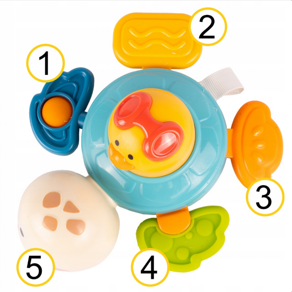 - Rotējošs elements – to var pagriezt, kas attīsta mazuļa motorisko koordināciju.