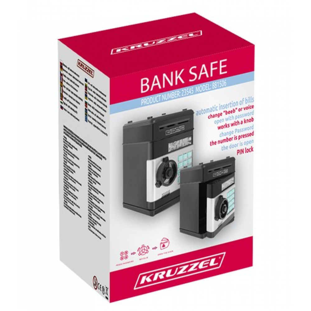 SPECIFIKĀCIJA – ražotājs: Iso Trade; zīmols: Kruzzel; durvis atveras pēc četrciparu PIN koda ievadīšanas; iespēja ievadīt savu paroli; banknotēm un monētām; bērna vecums 6+; iespēja mainīt skaņas uz balsi; pēc 20 sekundēm seifs atgādina par atvērtām durvīm; izmēri: 19,5 x 13 x 12 cm; svars: 0,55 kg; svars iepakojumā: 0,67 kg.
