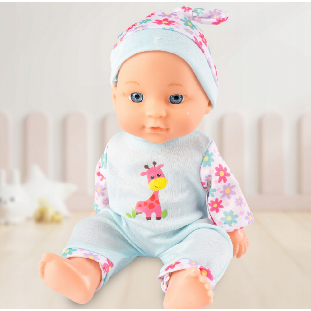 - Tam ir kustīgas ekstremitātes. Piederumu komplekts - podiņš, pudelīte, bļoda un galda piederumi barošanai. Mīkstas drēbes - ērtas un krāsainas, ar žirafes apdruku.