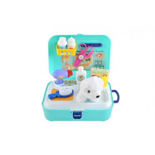 Suņu kopšanas komplekts koferī ir lieliska rotaļlieta ikvienam jaunam suņu mīļotājam. Viņš var droši rūpēties par mīkstu, mazu kucēnu, kas gaida pieskatītāju. Komplektā ietilpst piederumi, kas ļaus apgriezt nagus, ķemmēt, izmazgāt, izžāvēt un pabarot mājdzīvnieku. Tas viss ir aizvērts nelielā praktiskā mugursomā ar glabāšanas kastīti, kurā varam ievietot piederumus pēc spēles beigām. Tam ir regulējami bikšturi, ērts rokturis un aizdare, pateicoties kam rotaļlietas neizkritīs no kofera.