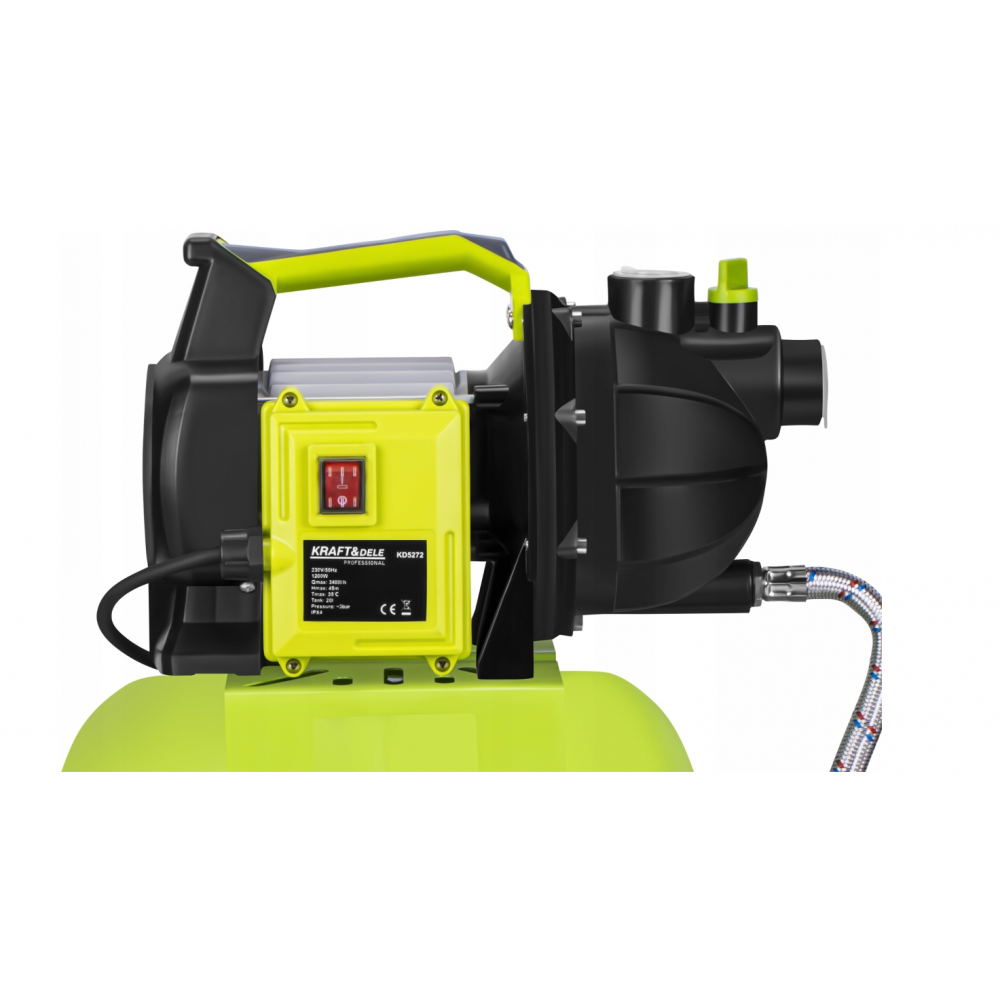 KD5272 ir jaudīgs 1200 W hidrofora sūknis no KRAFT & DELE , kas paredzēts dārzu, parku, dārzeņu dobju un zāliena smidzinātāju laistīšanai . Ar integrētu 20 litru hidrofora tvertni ierīce nodrošina stabilu spiedienu ūdens sistēmā un ērtu darbību.