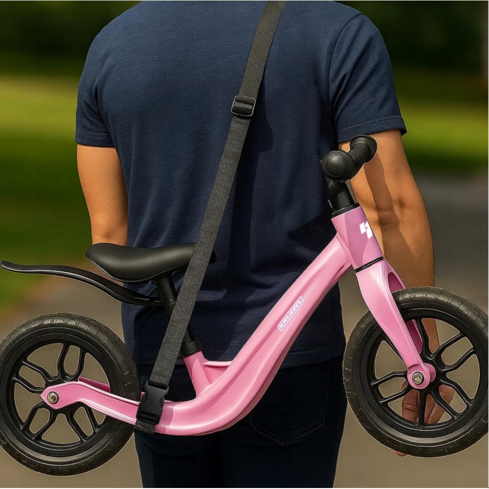 ✔️ Īpaši viegls ar iespēju to nēsāt uz pleca – velosipēds sver tikai 2,6 kg , tāpēc tas ir īpaši viegls un ērts , turklāt komplektā ietilpst plecu siksna , lai rokas būtu brīvas, kad bērns vēlas doties kājām
